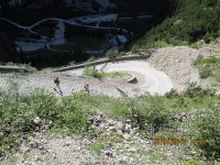 Ich lande schließlich auf einer Forststraße und an einem romantischen Bach mit Brücke, wo sich einige Wanderer und Ausflügler tummelten. Eine sehr paradiesische Gegend. Ich finde einen Wegweiser zur "Da Stua" Alm und folge diesem allerdings mit einem, wieder mal unsicheren Gefühl, denn an den folgenden Gabelungen und Abzweigungen waren keine Schilder mehr. Schließlich komme ich an einen Parkplatz, an dem ich wieder einen Wegweiser finde. Ich folge der sehr sehr steilen Teerstraße bis zur Alm wo ich meine Mittagspause an einem frischen, klaren Gebirgsbach einlegte.