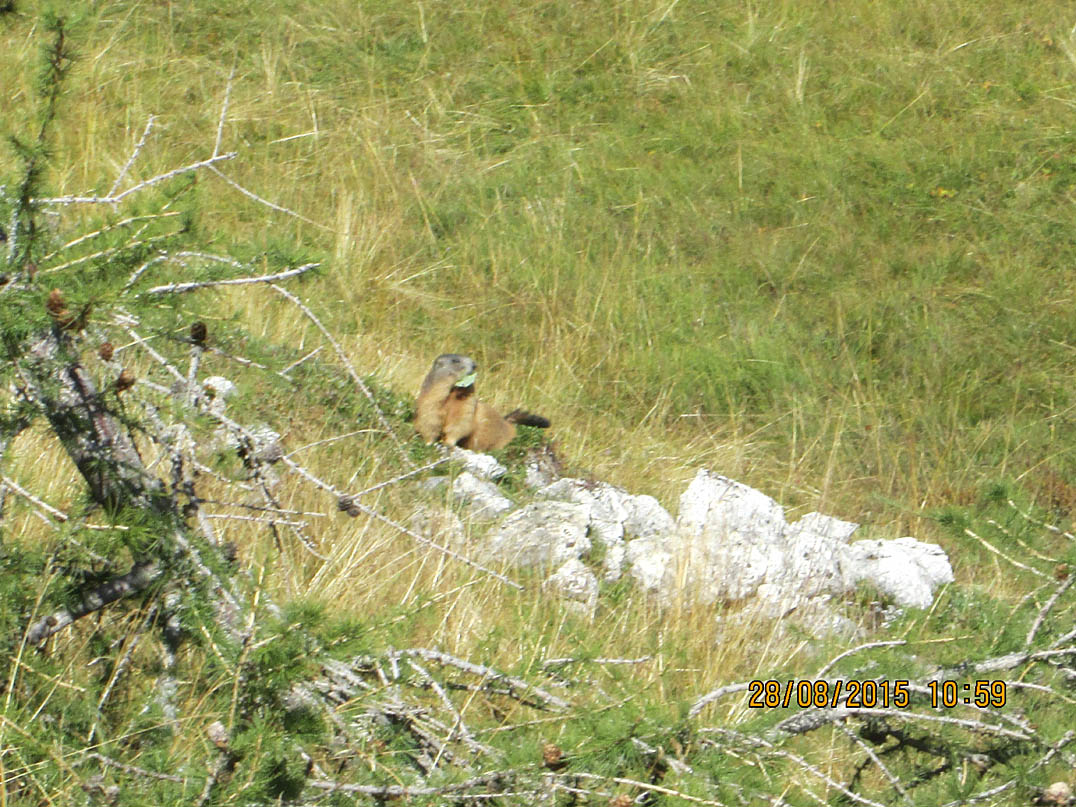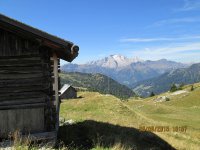 Demzufolge fuhr ich auch diesmal erst einmal einen Umweg, bevor ich auf den Trail in Richtung Andraz traf. Dieser führte durch eine unberührte Wildnis über Wiesen und durch niedrige Latschenwälder, in der Ferne immer die Marmolada im Blick. Manchmal erinnert diese Gegend an eine Art Hochmoor. Auch Murmeltiere gibt es hier. Man hört sie ständig pfeifen, aber die waren auf der gesamten Tour keine Seltenheit.