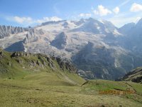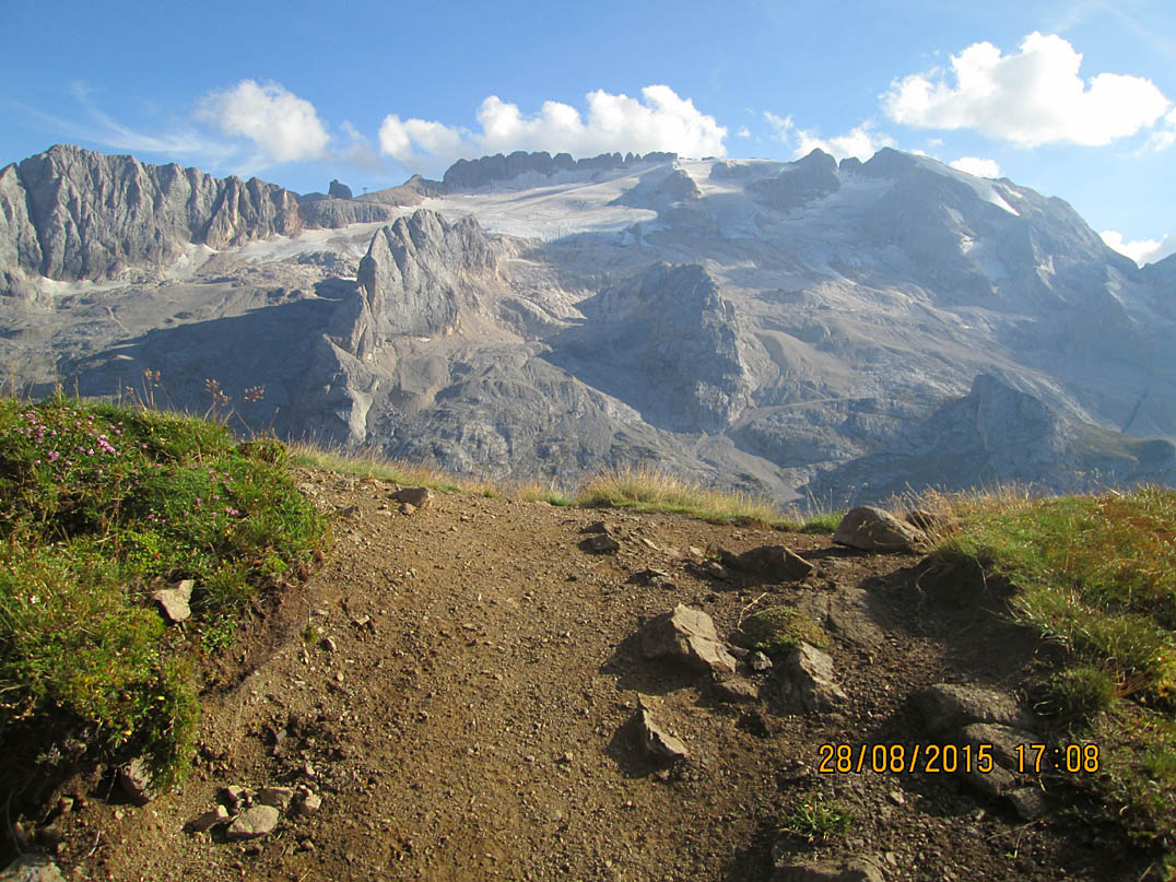 Die letzten 100 HM hab ich dann nur noch geschoben, aber dann...DIE MARMOLADA! Ein riesiger, mit einem Gletscher als Sahnehäubchen garnierter Felspudding. Keinen Kilometer Luftlinie von der Rückseite der Portavescovo Seilbahn entfernt stand der mit über 3300 Metern höchste Berg der Dolomiten in seiner ganzen Pracht vor mir. Am zweiten Tag als ich auf der Bündelweghütte nächtigte konnte ich den Berg nicht sehen, weil er nebelverhangen war, aber jetzt konnte ich alles nachholen.