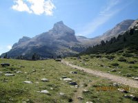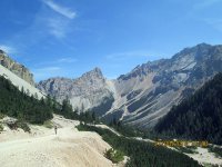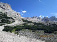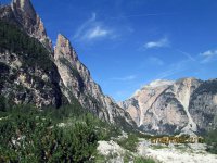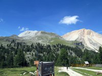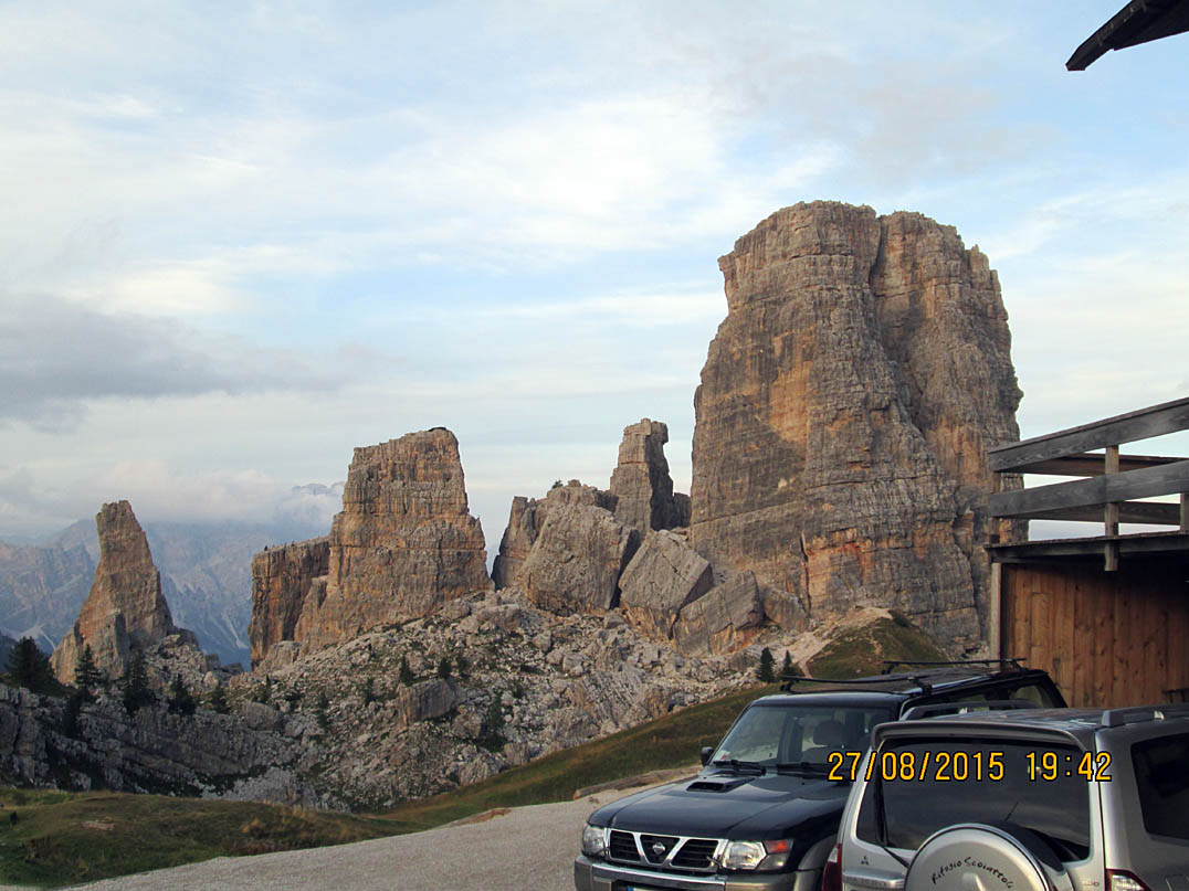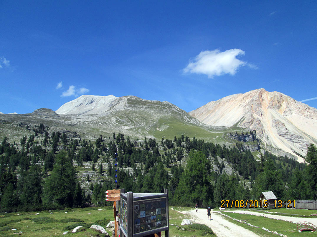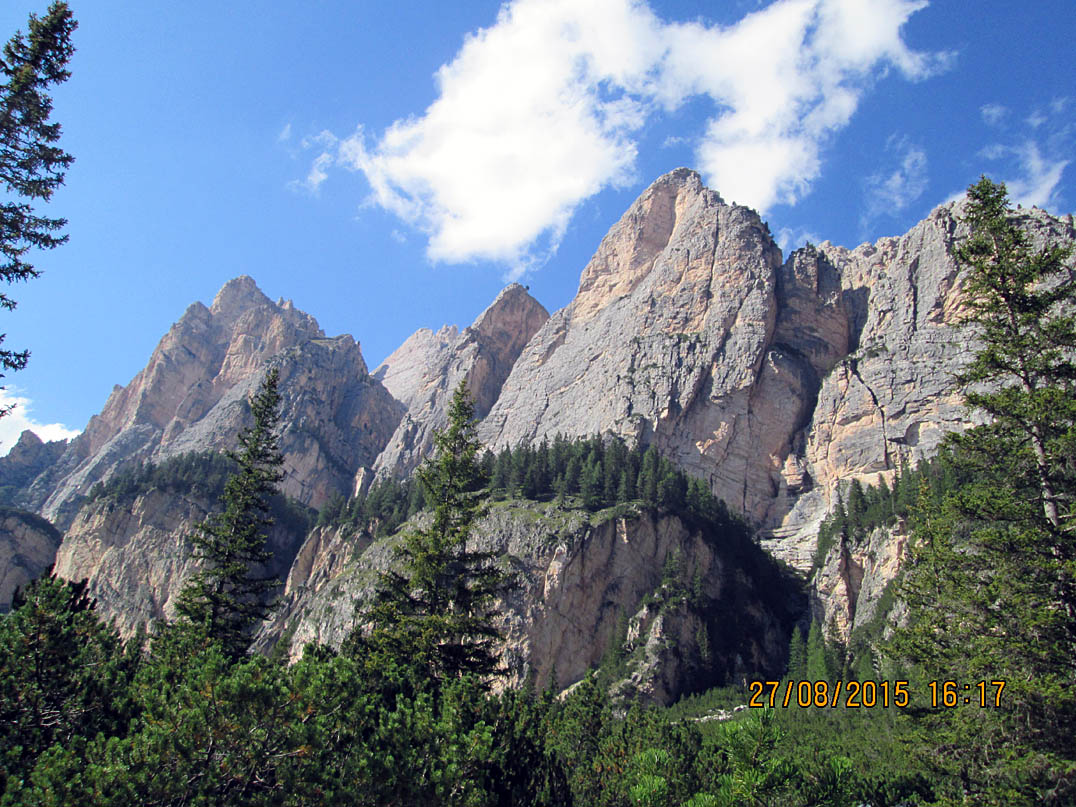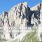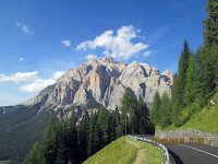 Neben mir ein Holzbrücklein und um mich rum Felsgiganten. Was für ein unbeschreiblich toller Platz und ein Moment, von denen es im Leben wahrscheinlich nicht so viele gibt. Nach 15 Minuten Relaxen war es an der Zeit weiterzufahren, denn ich war ja noch lange nicht am Ziel. Ich kurbelte den Valparola-Pass hinauf und zwar mit einer Leichtigkeit, über die ich mich selbst wunderte. Was acht Stunden Schlaf bewirken konnten war schon erstaunlich. Um ca. 17:20 Uhr, ich hatte die 500 HM des Passes in einer knappen Stunde fast bewältigt, scherte in einer Kurve plötzlich ein Ford Transit zum Überholen von drei oder auch mehreren Autos aus und kam mir mit Vollgas auf meiner Spur entgegen! Scheiße, bloß weg hier und ich sprang vom Rad, riss dieses zur Seite und brachte mich in einer Ausbuchtung in Sicherheit. Gerade noch rechtzeitig bevor der Rowdy an mir vorbei rauschte. Wäre an dieser Stelle eine Leitplanke gewesen, hätte ich über diese hinüber gemusst und bei Gott... Leitplanken sind nur an Stellen, an denen es steil bergab geht. Ich schaute zurück und merkte mir das Kennzeichen, kam aber relativ schnell von dem Schrecken wieder runter und ging über zum Tagesgeschäft. Oben am Pass hieß es wieder Fragen... zwei Motorradfahrer aus der Schweiz bestätigten mir, dass ich auf dem richtigen Weg sei und ich setzte meine Reise fort Richtung Falzaregopass Richtung Cortina d’Ampezzo bis ich am Sessellift hinauf zur Scoiattoli Hütte angelangt war.