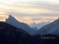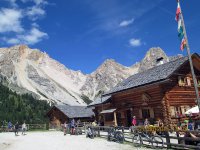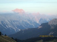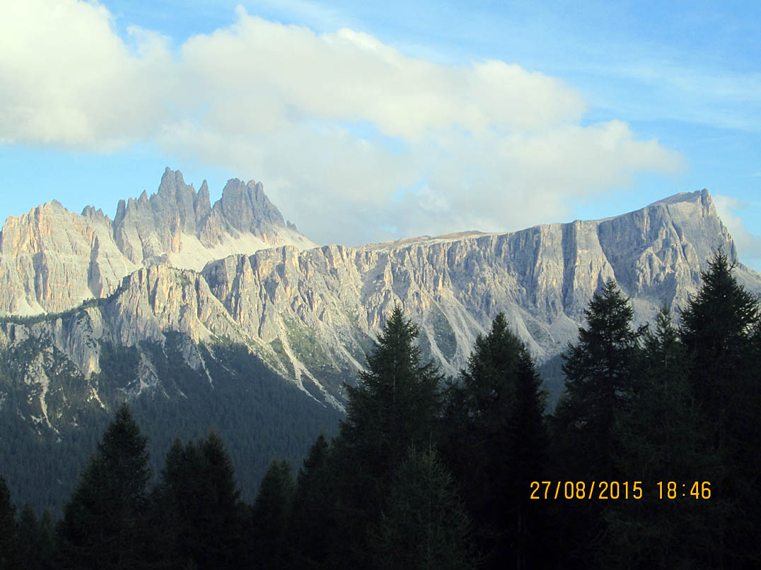Als ich mein Bike einen Stock tiefer verstaute, lernte ich Bob kennen, der auch gerade angekommen war. Bob ist US Amerikaner und war auch alleine wie ich, aber zu Fuß unterwegs. Wir verstanden uns auf Anhieb, saßen beim Abendessen am selben Tisch, unterhielten uns über Gott und die Welt, bestaunten den Sonnenuntergang und der Zufall wollte es, dass wir auch dasselbe Zimmer zugewiesen bekamen. Das Essen, ein Dreigangmenü war übrigens im Übernachtungspreis von 58,00 € inbegriffen, genau wie das Frühstück. Bob ist ein total sympathischer Mensch und ich denke es sind Begegnungen wie diese, die Gold wert sind und die man nur macht, wenn man alleine unterwegs ist. Ein weiterer unvergesslicher Tag in den Dolomiten.