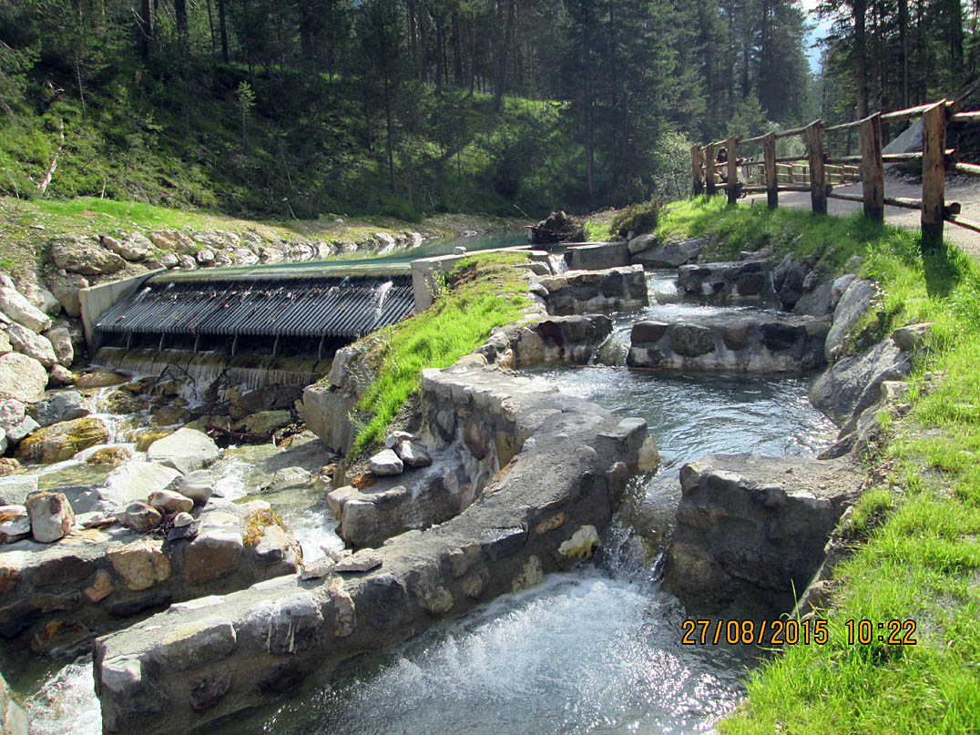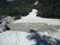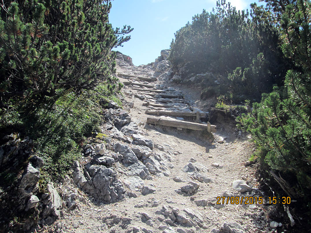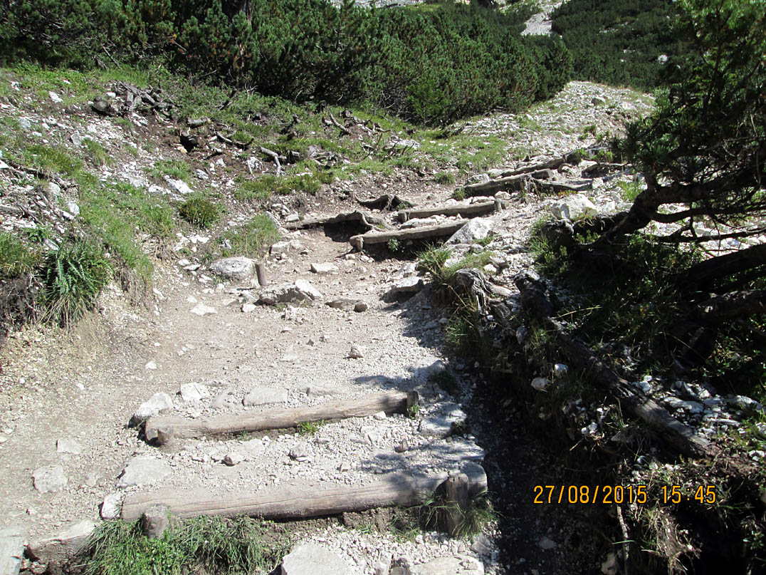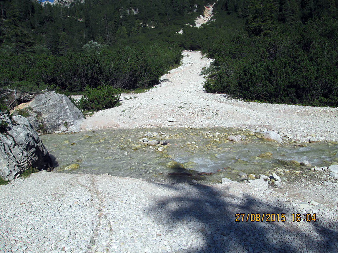 Jetzt erst konnte ich die unglaubliche Schönheit dieser Gegend in vollen Zügen genießen. Ich setzte mich an eine Bank mit einem Wegkreuz und einem großen Stein davor, packte meine Brotzeit aus und lachte mich halb schwindelig als ein Dackel meine Tomatenreste fraß, die ich kurz davor einem Huhn hingeworfen hatte, welches diese jedoch verschmähte. Die Abfahrt Richtung Col de Locia bin ich regelrecht geflogen, ab der "Capanna Alpina" dagegen ging es steilst bergab. In Stufen, bei denen sich die Wanderer schwer taten. Ich hievte mein Rad Stufe für Stufe hinunter bis der Trail wieder fahrbar war. Jedoch Kategorie S5 würd ich mal sagen. Für mich definitiv noch zu hoch um ohne abzusteigen bis ganz unten durchzufahren. Aber ein paar knifflige Stellen hab ich schon ganz gut gemeistert obgleich ich mir wiedermal den linken Fuß verstauchte und ich mir vorgenommen habe, mir Gedanken über mein Schuhwerk zu machen, sobald ich wieder zu Hause bin. Am Ende des Trails querte ein romantisches Bächlein den Weg und ich rauschte mit dem Bike durch, bevor ich meine Füße zum Kühlen hineinhing.