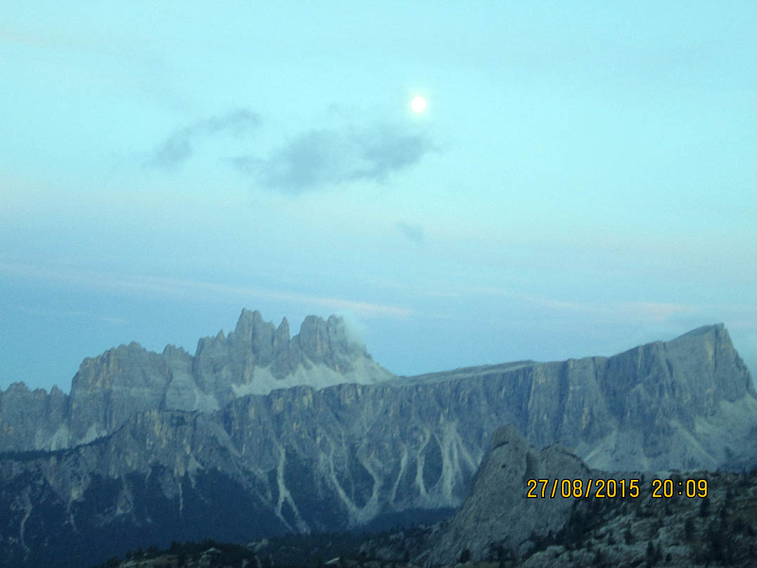 Der Lift hatte zwar schon zu aber ich wollte ohnehin nicht Seilbahn fahren, also suchte ich den Wegweiser und folgte diesem, teils fahrend, schiebend, tragend... dann war ich an der Scoiattoli Hütte angelangt. Diese Hütte gehört von der Lage, von der Ausstattung und von de Küche her wahrscheinlich zum Feinsten, was die Alpen zu bieten haben. Ich bestellte sofort ein Weißbier, zückte meine Kamera und fotografierte was das Zeug hielt. Was für ein Panorama! Und dann noch der Sonnenuntergang. Direkt vor der Hütte befinden sich die "Cinque Torri" - eine Formation aus fünf bizarren Felstürmen, die im Abendlicht erstrahlten. Der fast volle Mond im Hintergrund.