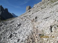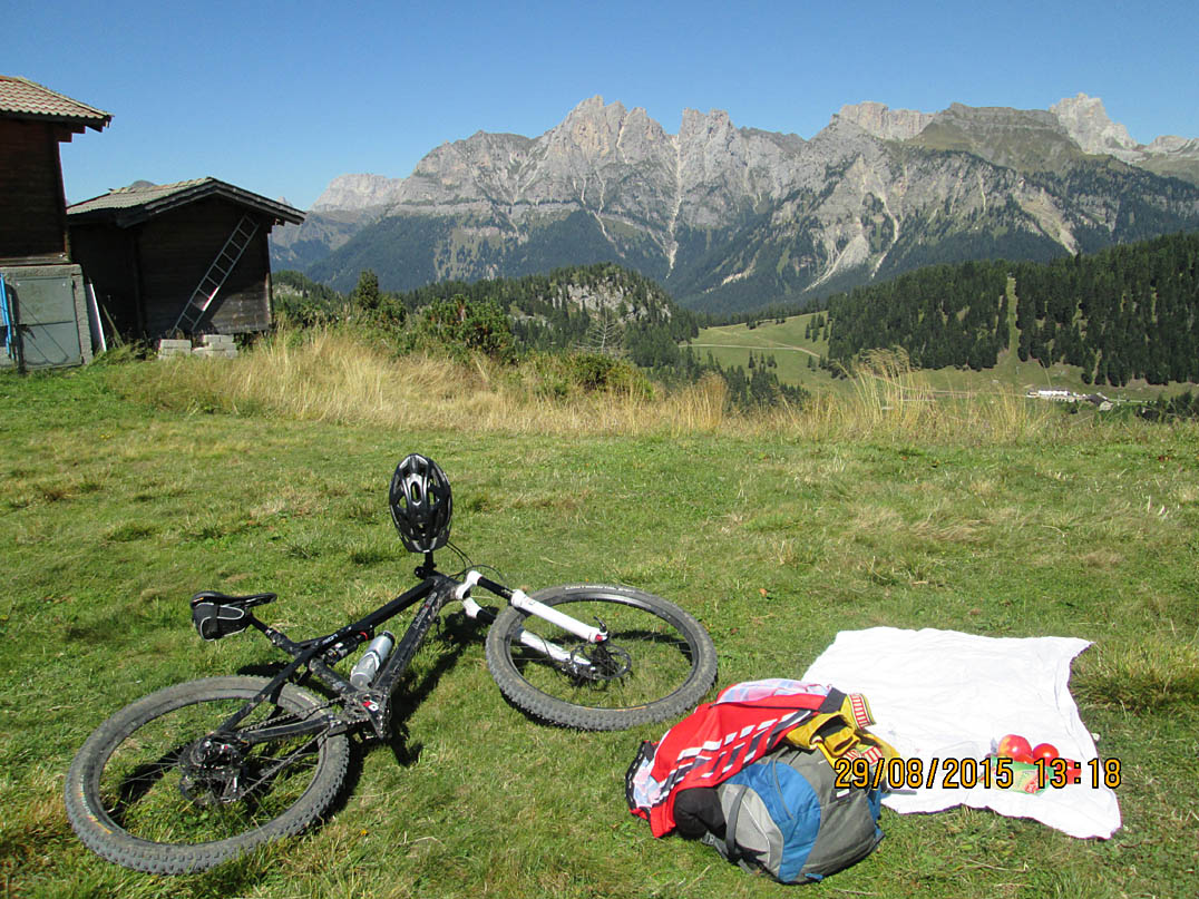 Am Col dei Baldi auf einer wunderschönen Wiese auf knapp 2000 Metern mache ich zu Mittag ein Picknick und fahre weiter zum Passo Staulanza und zur Citta di Fiume (eine Hütte). Dort verliere ich den Weg und zwar an der Tragestrecke, einem Wandwerweg. Jedesmal in einer solchen Situation kommt in mir unweigerlich der Zorn über die italienische Wegweiserschlamperei hoch.
