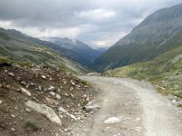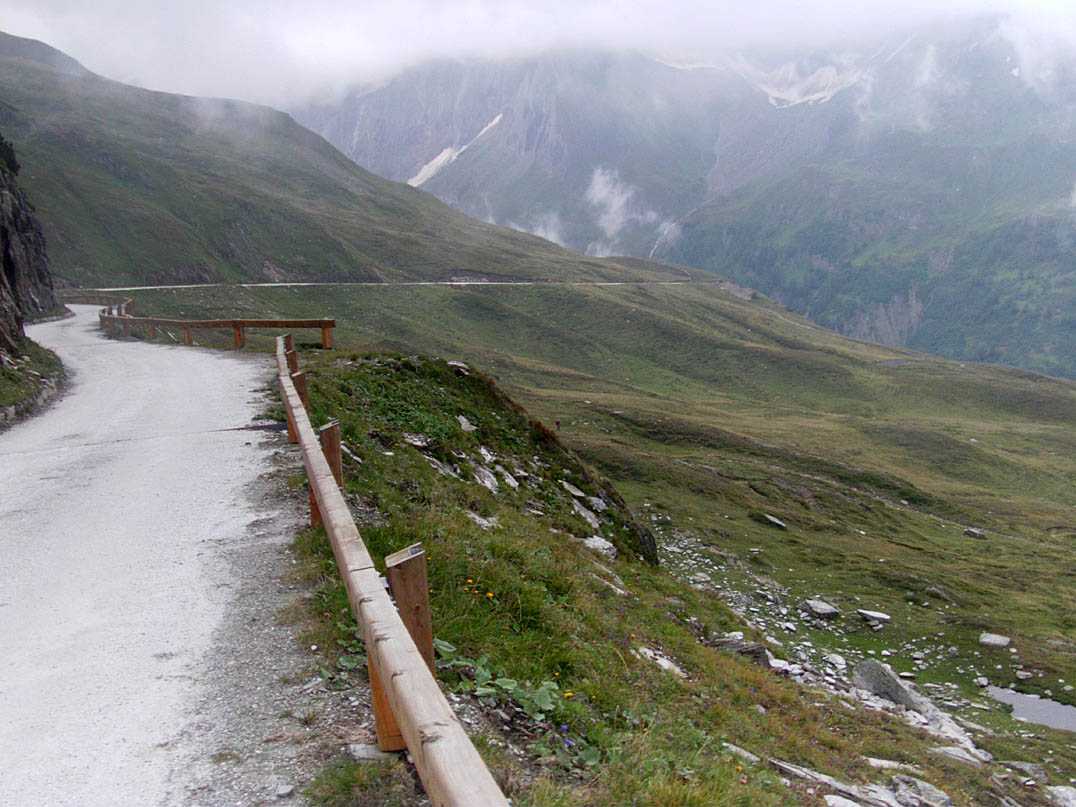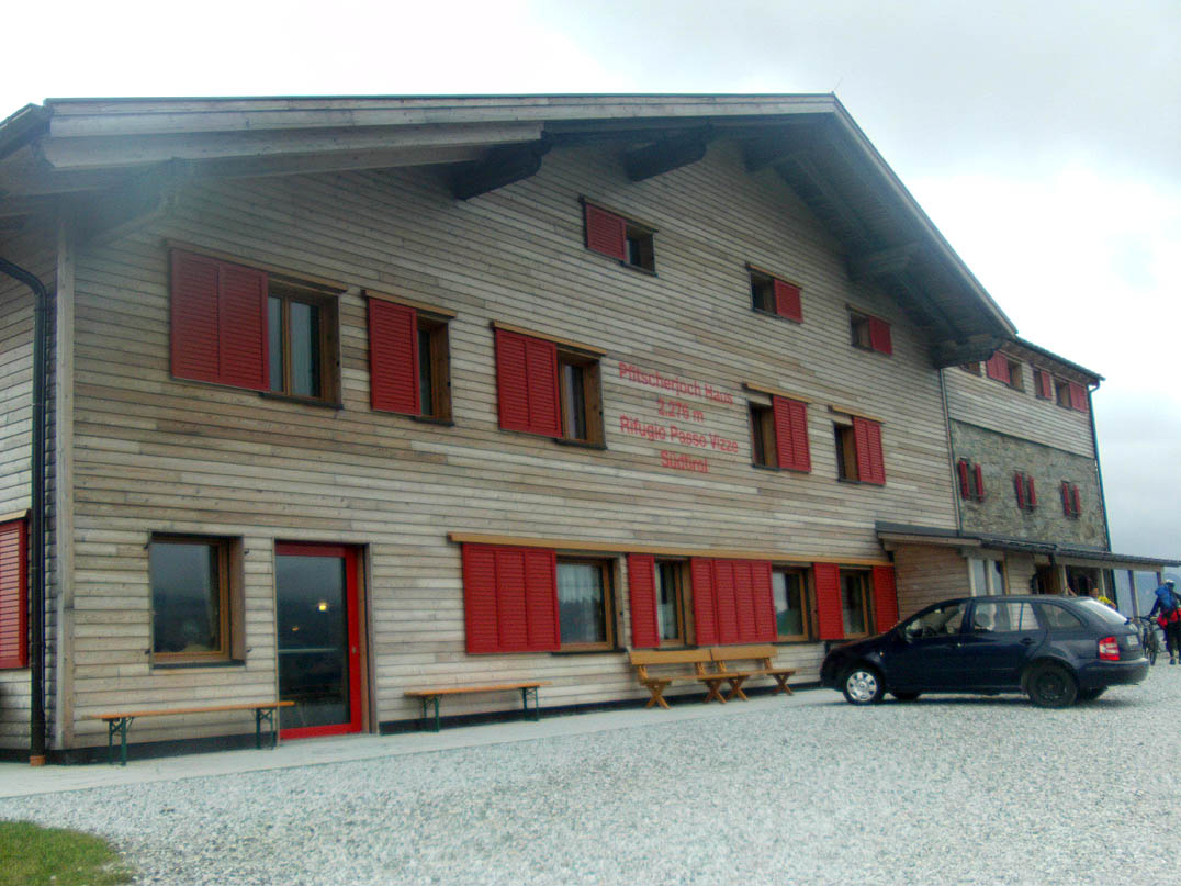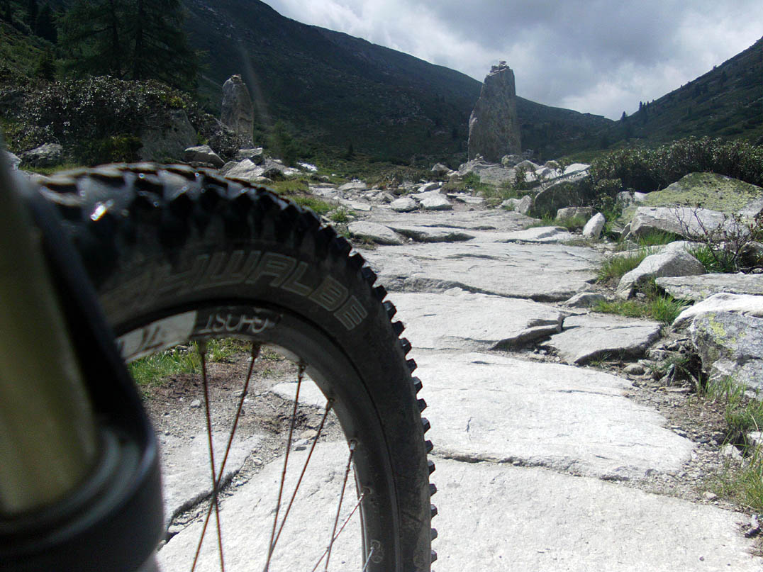 Der Weg Richtung Pfitscherjoch ist für Radfahrer das, was ich als "boanig" bezeichne. Charakteristisch sind die aneinandergelegten Steinplatten, die bei immer wieder querenden Bächen, 10-25 cm auseinanderklaffen. Diese wechseln sich mit spitz aus dem Boden ragenden Geröllformationen ab und man muss höllisch aufpassen, dass man nicht hängenbleibt oder sich den Reifen aufreißt. Ständig der Wechsel zwischen schieben und fahren, und eine Menge Wanderer, die aber alle gut gelaunt waren. Ich mache Rast an einem romantischen Bächlein, fülle meine Flaschen auf und greife das letzte Stück zum Pfitscherjochhaus an. Ich esse dort eine Speckknödelsuppe, während es immer mehr zuzieht. Die Abfahrt über einen zwar guten, aber immer wieder von unterschiedlich tiefen Querrinnen durchzogenen Weg ist frisch und es beginnt zu regnen. Vollkommen durchnässt beginnt die Quartiersuche in Sterzing.