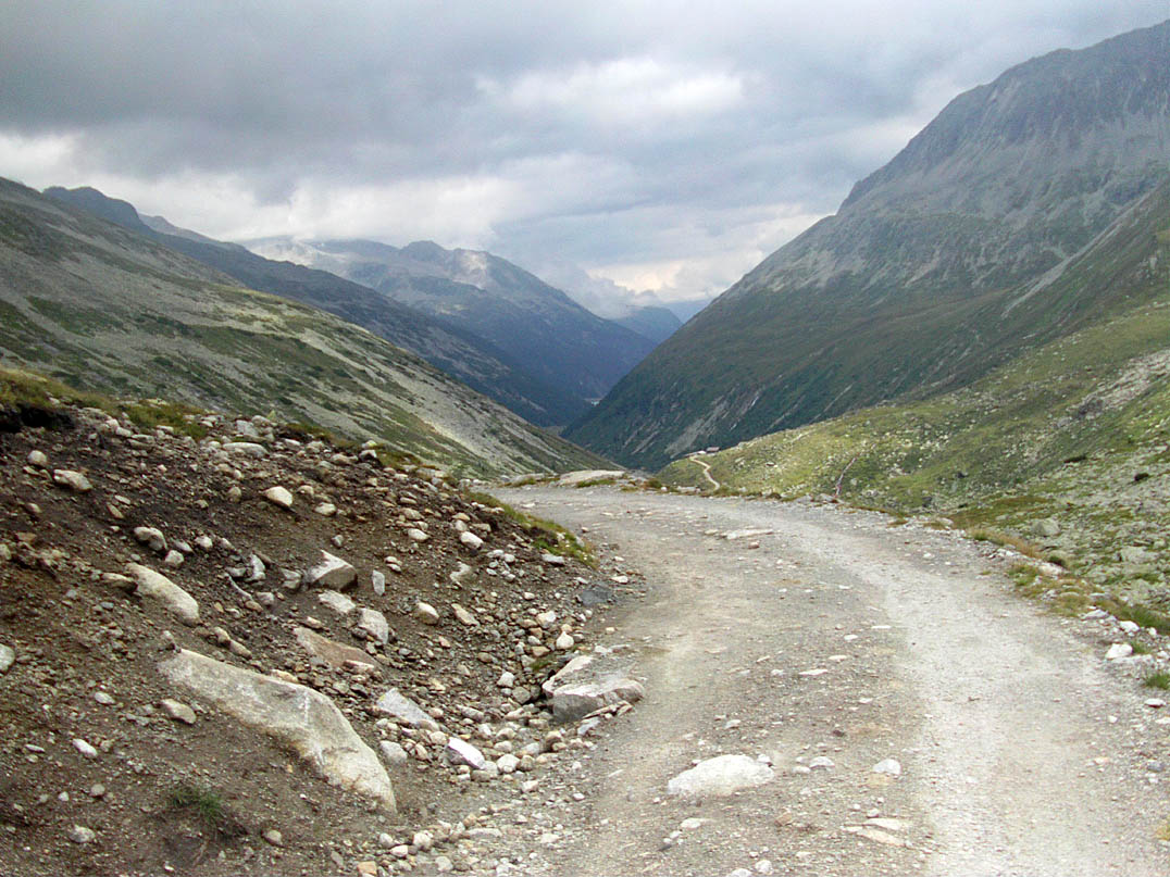 Erstaunlicherweise habe ich die doppelte Etappe vom Vortag gut weggesteckt. Ich breche um ca. 09:30 Uhr auf und fahre den MTB Weg Richtung Schlegeisspeicher. Ein holpriger, teils schlammiger Weg mit kurzen Schiebepassagen, aber alles in allem gut zu fahren. Die Anstiege sind passabel. Ich will noch ein letztes mal das Tal fotografieren, in dem ich übernachtet habe und... die Kamera springt nicht an... ICH HABE EIN KAMERAPROBLEM!!! Lag es daran, dass ich nach dem Aufladen das Kabel die ganze Nacht in der Kamera stecken ließ?