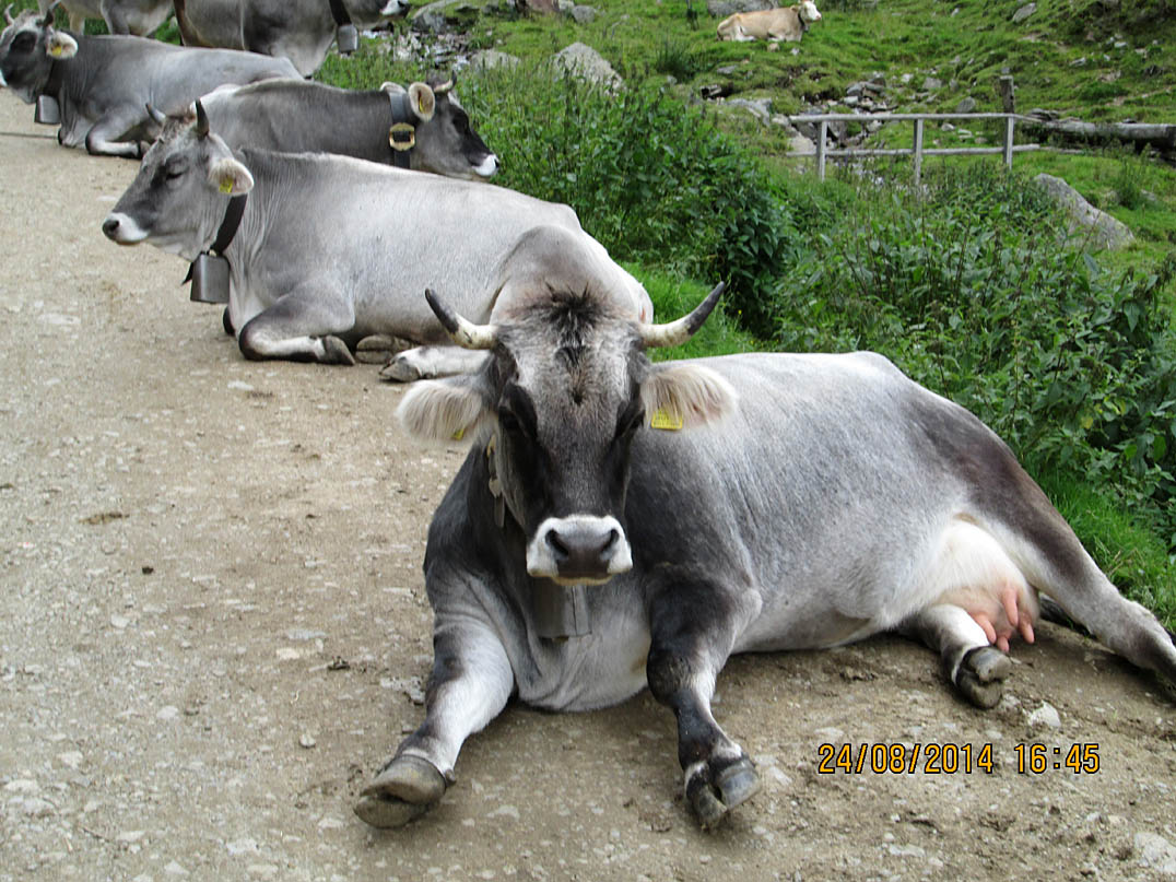 Die letzten 4 km ab der Kirchbergalm ist nur noch schieben angesagt, weil der Schotterweg einfach zu steil ist und ab der letzten kleinen Alm vor dem Pass fast nur noch aus steinigen Stufen besteht, über die ich mein Rad heben muss. Außerdem hab ich heute keinen Bock mehr zu radeln weil der Weg durchs Ultental so anstrengend war.