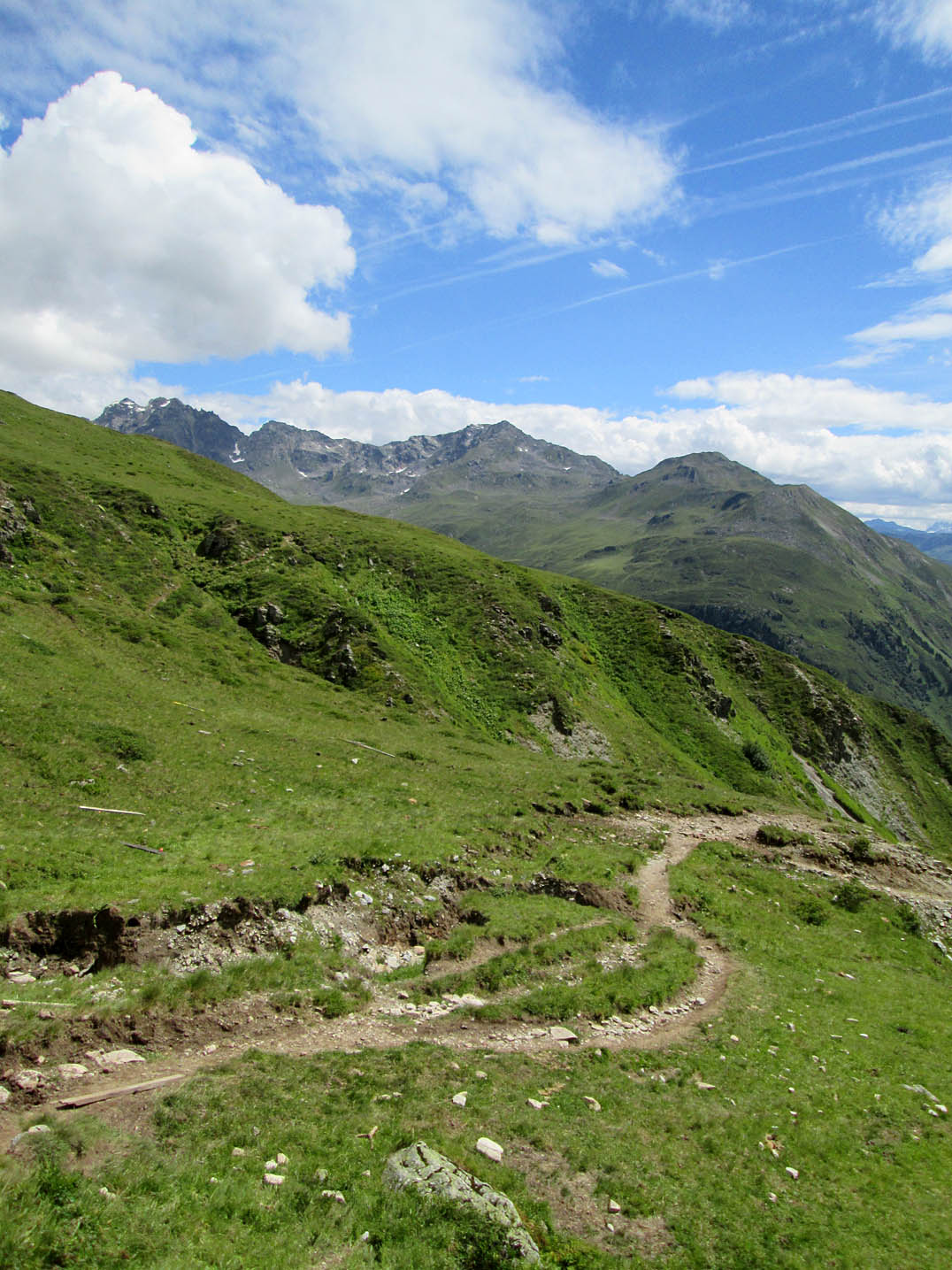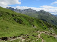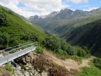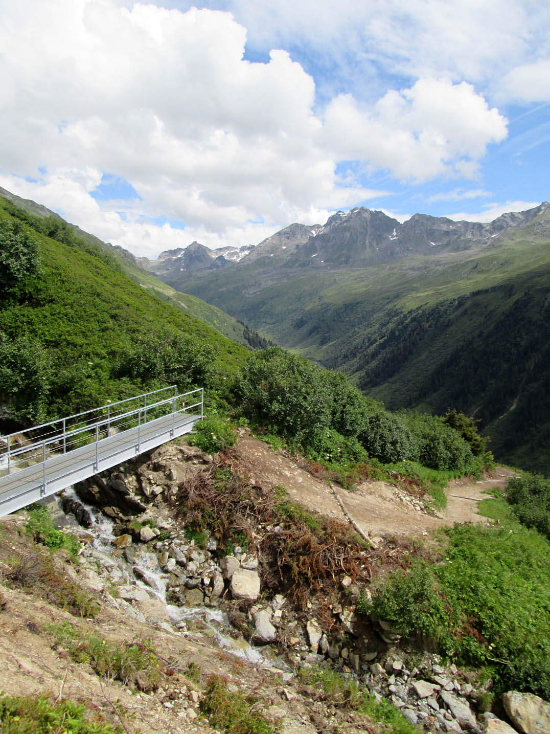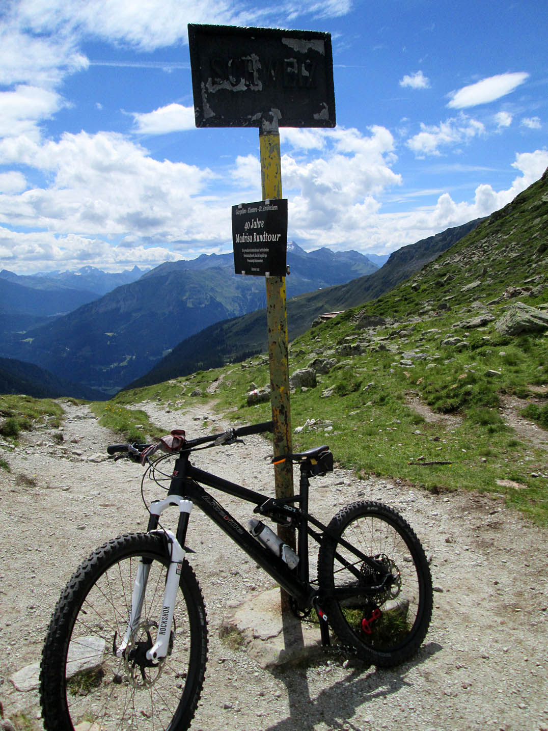 Ich querte einen Bach und kurz darauf kam mir auch schon der erste "Bullcartracer" mit seinem tiefergelegten Dreirad entgegen. Als ich dann wenige Meter weiter ein Radfahrverbotsschild sah, dachte ich, dass es vielleicht doch besser wäre den Weg auf der anderen Seite des Baches zu nehmen. Wenig später passierte ich die untere, dann die obere Valzefizalpe und kam schließlich an ein Brücklein, auf dessen anderen Seite nur noch schieben, dann tragen möglich war, was ich dann auch die ganze nächste Stunde tat. Oben am Schlappinerjoch auf ca. 2200m angekommen, offenbarte sich mir der erste grandiose Rundblick Richtung Schweiz und zurück Richtung Schruns.