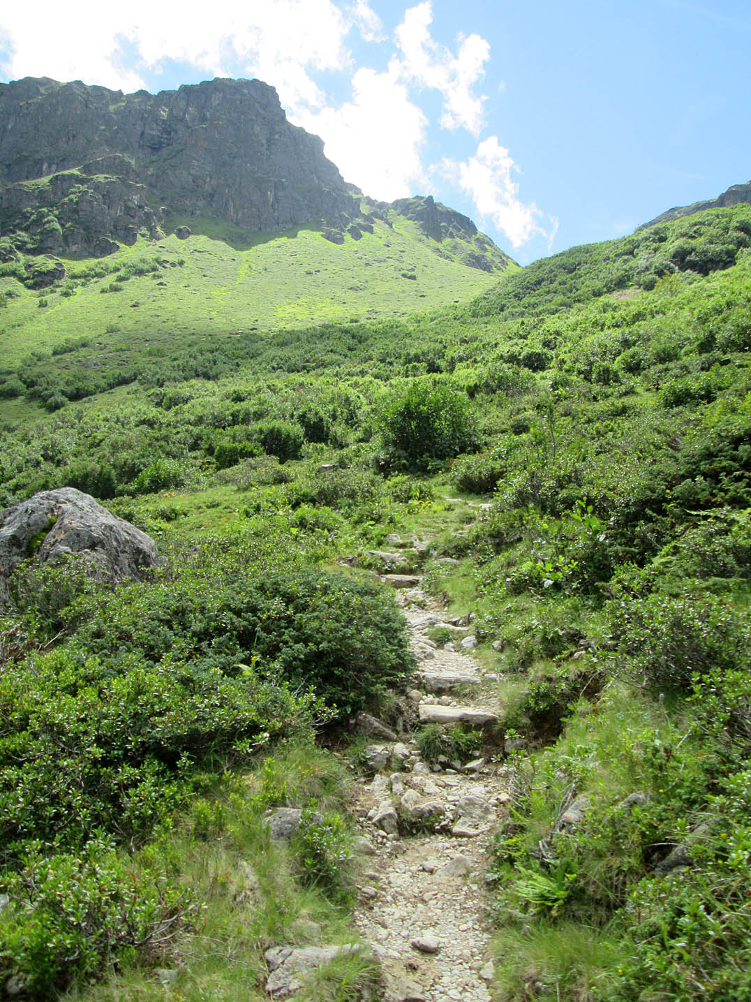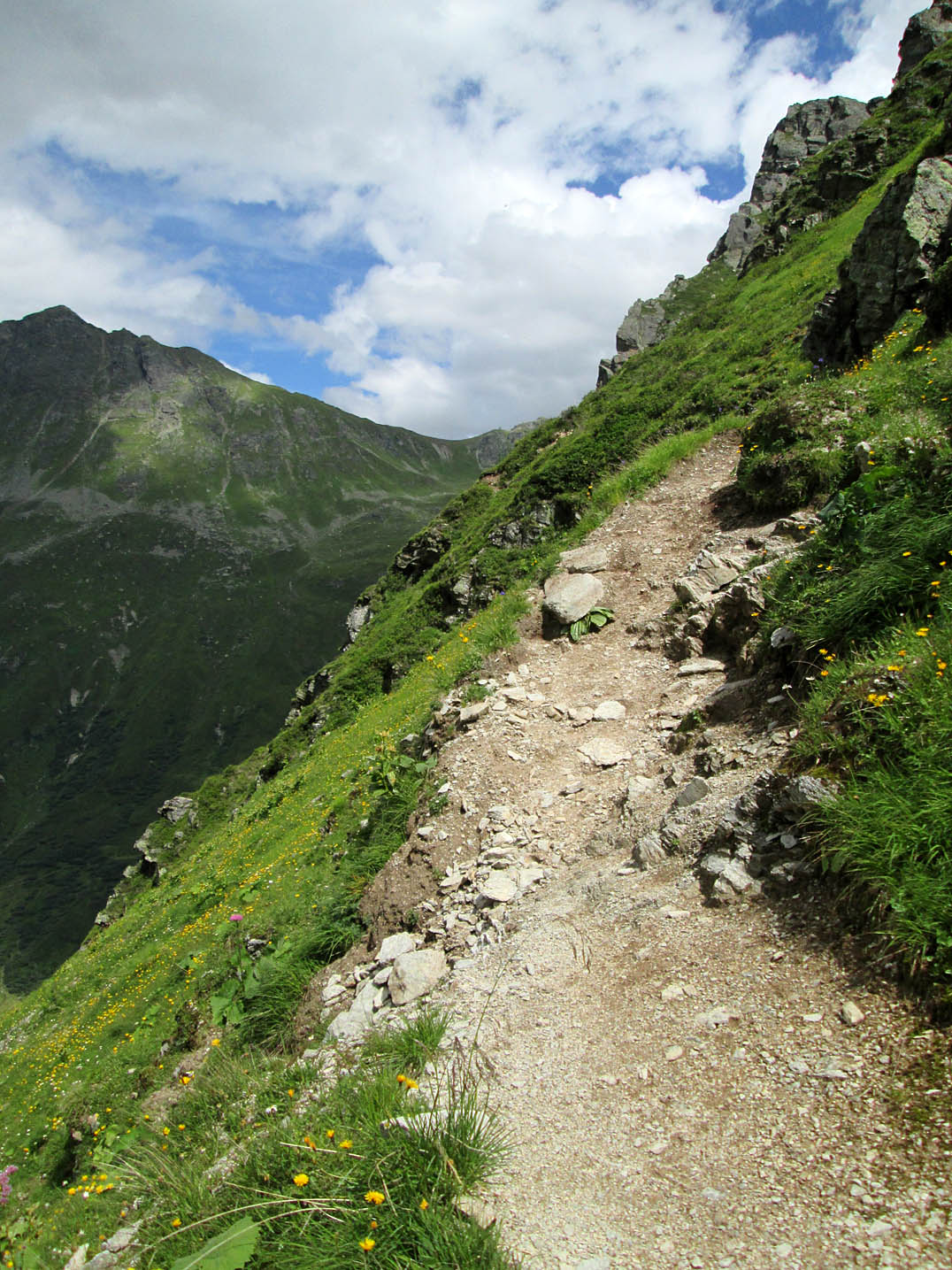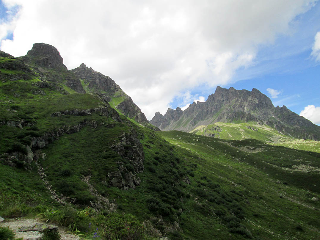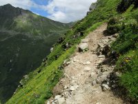 Ich querte einen Bach und kurz darauf kam mir auch schon der erste "Bullcartracer" mit seinem tiefergelegten Dreirad entgegen. Als ich dann wenige Meter weiter ein Radfahrverbotsschild sah, dachte ich, dass es vielleicht doch besser wäre den Weg auf der anderen Seite des Baches zu nehmen. Wenig später passierte ich die untere, dann die obere Valzefizalpe und kam schließlich an ein Brücklein, auf dessen anderen Seite nur noch schieben, dann tragen möglich war, was ich dann auch die ganze nächste Stunde tat. Oben am Schlappinerjoch auf ca. 2200m angekommen, offenbarte sich mir der erste grandiose Rundblick Richtung Schweiz und zurück Richtung Schruns.