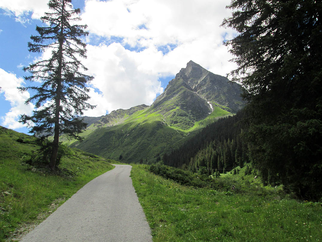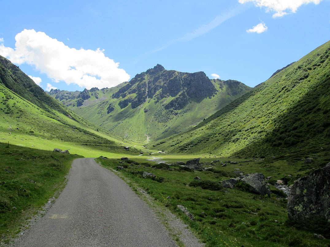Ich startete nach dem Frühstück Richtung Gargellen und musste mich anfangs ein paar mal mit Hilfe meiner Karte orientieren, was aber half und ich mit einigen Stops aber stetig vorankam. Bereits am Vormittag brannte die Sonne so richtig herunter und ich cremte mich erst einmal ein um keinen Sonnenbrand zu bekommen. Die Teerstraße nach Gargellen war richtig steil und zog sich ewig hinter ins Tal. Nach einer kurzen Mittagsrast in Gargellen machte ich mich auf die Suche nach der Auffahrt zur unteren Valzefizalpe.