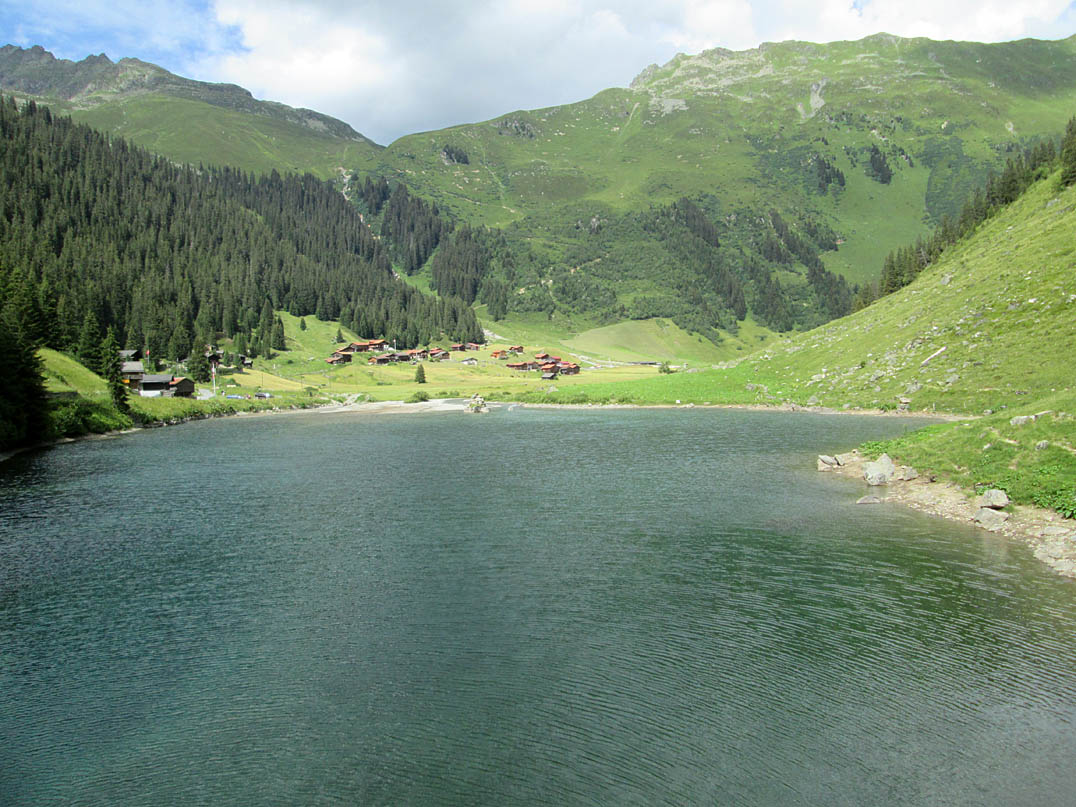 Der Trail runter war relativ flowig. Anfangs ein Singletrail, wenig später ein breiterer Weg immer wieder mit quer gelegten Rundhölzern stabilisiert, damit er bei Regen nicht abrutscht. Ich querte eine kleine Brücke und mündete unten im kleinen Dorf Schlappin, welches an einem malerischen kleinen See liegt, in eine Teerstraße die sich immer wieder von einem kleinen Singletrail gekreuzt, bis runter nach Klosters hinzog.