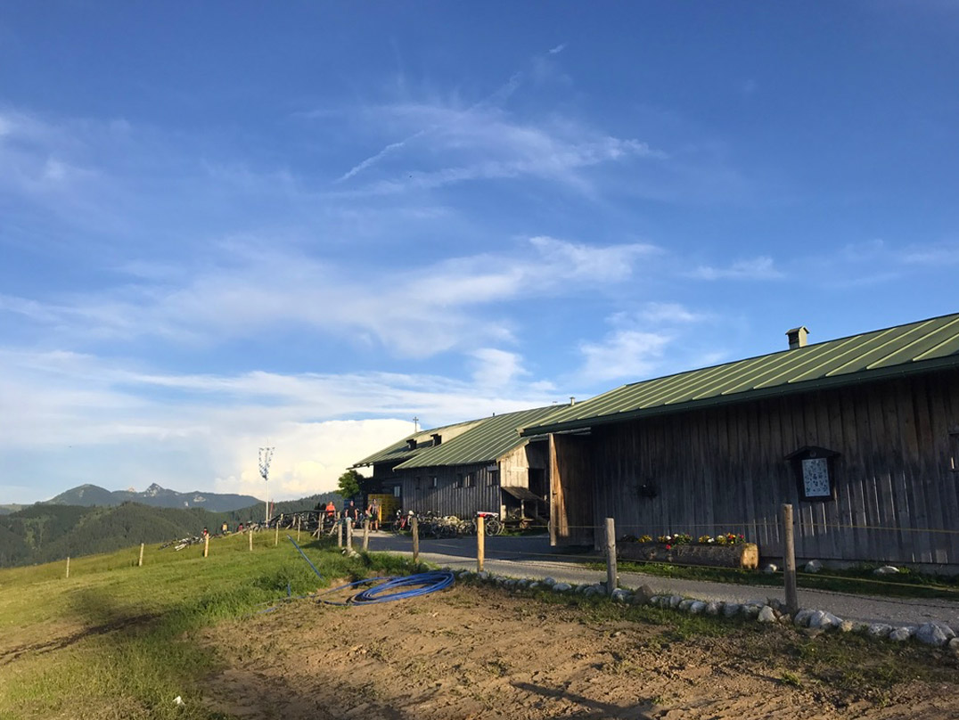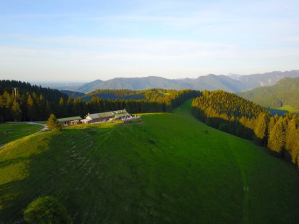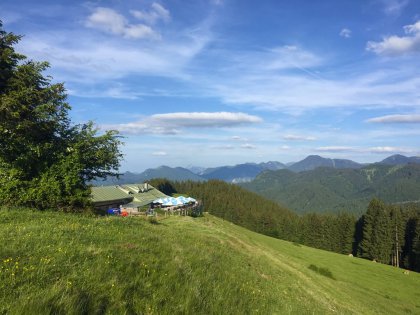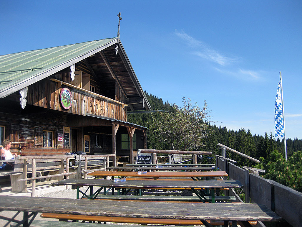 Auf der Sonnenterrasse genießt man leckere Hüttenmahlzeiten von der urigen Brotzeit über selbstgemachte Kuchen bis hin zu warmen Gerichten und hat dabei einen tollen Rundumblick über die Berge der bayerischen Voralpen.