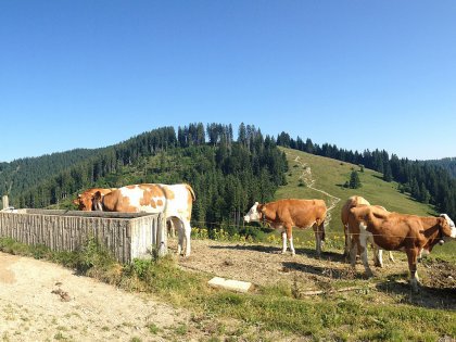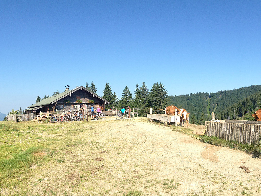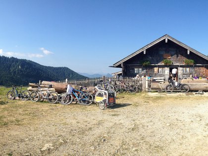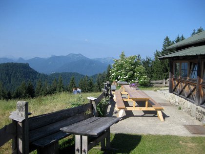 Zahlreiche Holztische und Bänke - teilweise überdacht - laden im Freien zu einer gemütlichen Einkehr mit Weitblick ein. Neben der Alm grast das Jungvieh auf der abgezäunten Almweide, das Panorama geprägt vom saftigen Grün der Wiesen und dem kräftigen Blau des oberbayerischen Himmels, die anderswo oft bemerkbare "Touristen-Hektik" ist selbst an traumhaften Tagen nur selten wahrzunehmen.