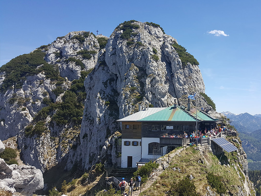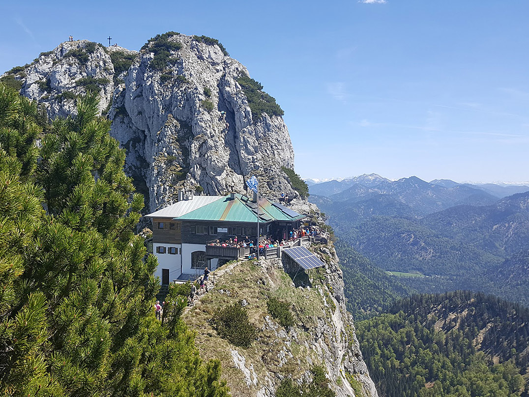 Bis weit in die Ferne auf den Alpenhauptkamm, über das Karwendelgebirge hinweg auf die Zugspitze (2962m) und das Alpenvorland - der Ausblick von der Tegernseer Hütte zählt ohne Zweifel zu den imposantesten in den Bayerischen Voralpen. Auf dem gerne als Adlerhorst bezeichneten Sattel zwischen Roßstein (1697m) und Buchstein (1702m) zählt die bewirtete Alpenvereinshütte der Sektion Tegernsee zu den schönsten Hütten in ganz Bayern. Und dabei ist sie noch nicht einmal so schwer zu erreichen, was man unweigerlich feststellen muss wenn der Andrang an schönen Sommertagen groß ist.