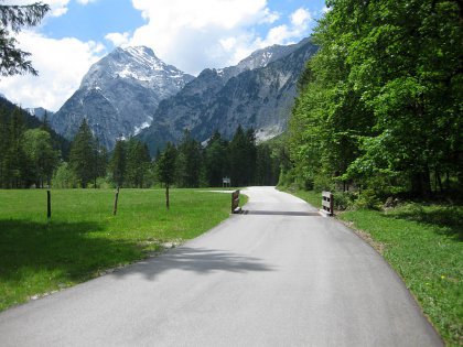 An der Karwendelbergbahn in Pertisau folgen wir anfangs der Teerstraße vorbei am Gasthof-Pension Golfvilla und in gerader Richtung hinter bis zum Waldrand. Dort verläuft die Teerstraße bis zu einer Gabelung, bei welcher sich am Anfang des Forstwegs eine Schranke befindet. Wir folgen dem Forstweg zwischen Bäumen hindurch in Richtung Süden und halten uns an der nächsten Weggabelung rechts. Die bis hierhin leicht ansteigende Teilstrecke liegt hinter uns, es geht nun sogar etwas bergab weiter, bis das Gelände nach circa zwei Kilometern kurz vor einer Linkskehre wieder ansteigt.