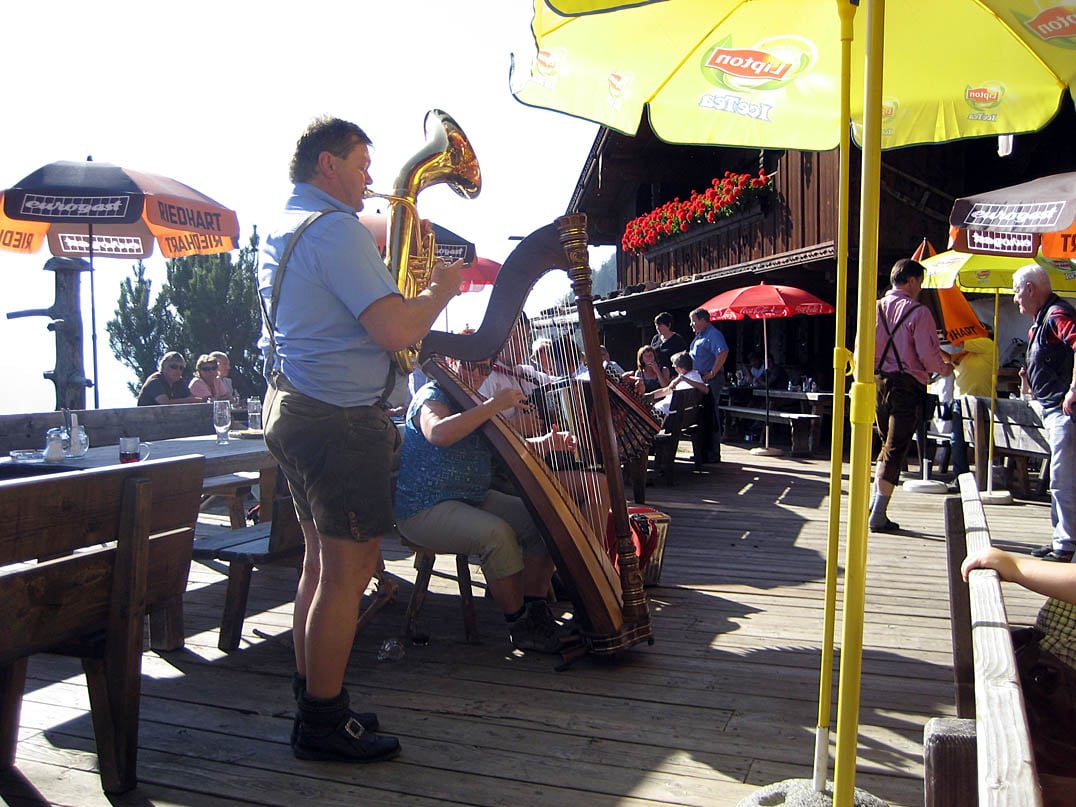 In einer Rechtskurve biegen wir noch vor dem Gefälle links ein und folgen der Straße anschließend für nur knapp dreihundert Meter voran. Unmittelbar an einem Bauernhaus bei Außerbischofen biegen wir links in eine Spitzkehre. Hinter dem Haus mündet die Teerstraße schließlich in einen Kiesweg, welcher uns etwa zwei Kilometer weit mit einer Steigung um die vierzehn Prozent im Zickzack den Südhang des Gratlspitz (1894m) Ausläufers hinauf windet. Während der Auffahrt entlang der zumeist freien Berghänge genießen wir den Blick auf die gegenüberliegenden Berge - allen voran das Wiedersberger Horn (2127m) sowie am Ende des Alpbachtals den Großen Galtenberg (2424m). Wir erreichen schließlich die Bischofer Alm (1320m), das Ziel dieser Tour. Die gemütliche Rast auf der großzügigen Sonnenterrasse mit Aussicht wird oft vom Wirt selbst und einigen Musikanten durch zünftige Live-Musik zum ereignisreichen Highlight nach erfolgter Anstrengung.