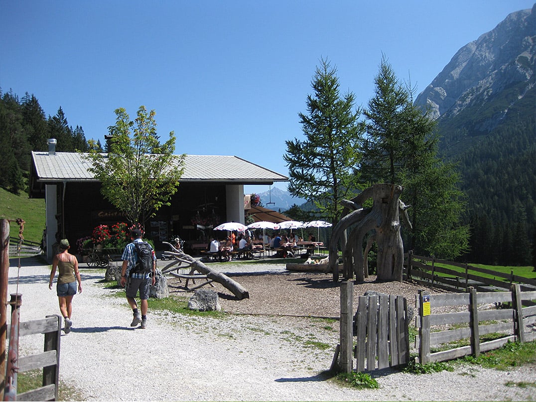 Nach weiteren zweieinhalb Kilometern passieren wir die Abzweigungen zur bewirtschafteten Gaistalalm (1366m) und der quasi in der Nachbarschaft befindlichen Tillfussalm (1382m), die ebenfalls die vielen Wanderer und Radfahrer zur gemütlichen Einkehr lockt. Wir jedoch halten uns parallel zum Lauf der Leutascher Ache auf dem ausgeschilderten Bike Trail Tirol. Etwa sechseinhalb Kilometer bleiben wir stets auf dem Hauptfahrweg in Richtung Ehrwalder Alm, Seebenalm und Coburger Hütte. Dabei lassen wir auch die Abzweigung zur Hochfeldernalm (1732m) unbeachtet rechter Hand vorbeiziehen.