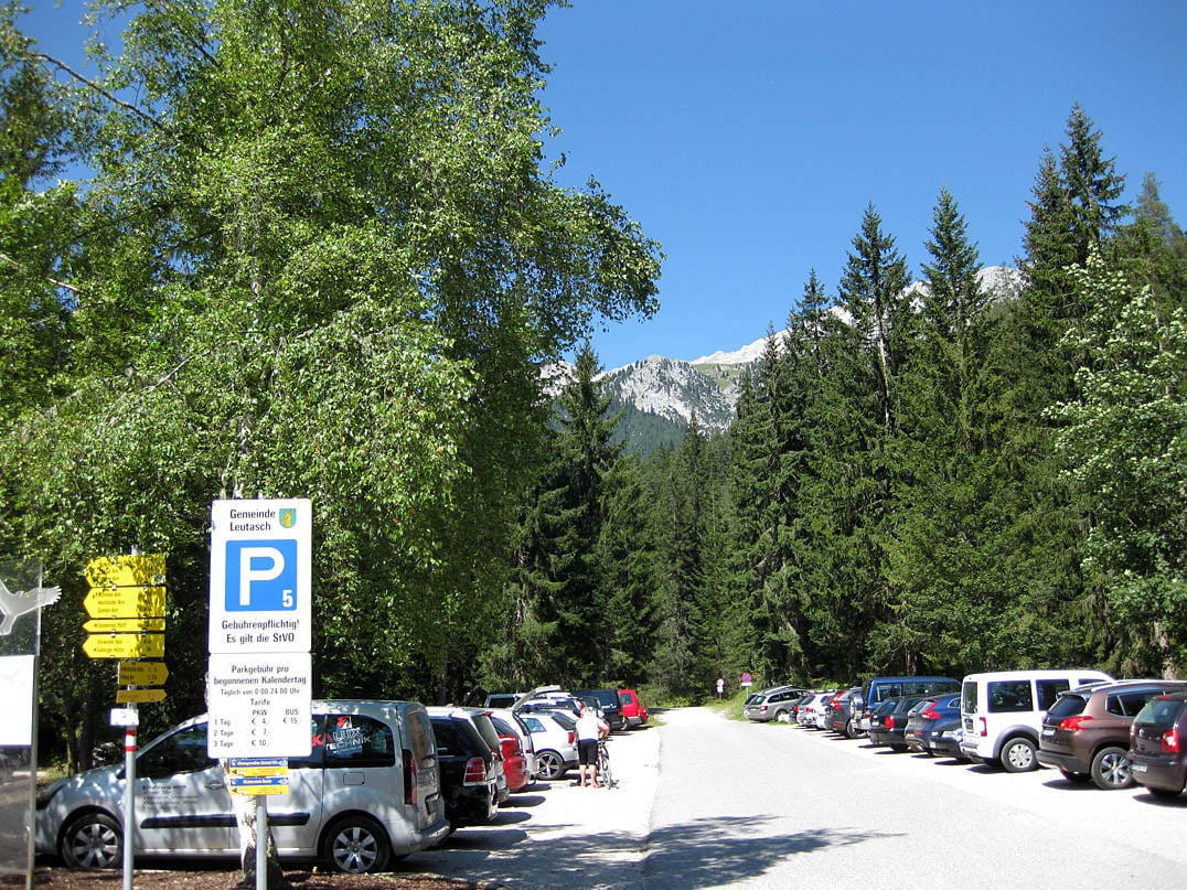 Vom Parkplatz Salzbach bei Leutasch folgen wir der kleinen Brücke über den Bach hinweg und finden uns unmittelbar auf einem ausgebauten und gut befahrbaren Kiesweg wieder. Wir folgen dem Forstweg bei leichtem Anstieg für etwa zweihundert Meter und biegen anschließend nicht nach rechts auf den Ganghoferweg ab, sondern folgen der Beschilderung nach links über die Forststraße hinein ins Almenparadies Gaistal. Nach etwa achthundert Metern halten wir uns an einer Weggabelung ein weiteres Mal links. Bereits jetzt lässt sich erahnen welches Panorama sich uns entlang dieser Tour präsentieren wird. Stets die schroffen Nordflanken der Mieminger Kette im Blick fahren wir durch das zunächst noch deutlich bewaldete Gebiet teilweise bergab und anschließend mit relativ moderater Steigung tiefer ins eindrucksvolle Gaistal hinein.