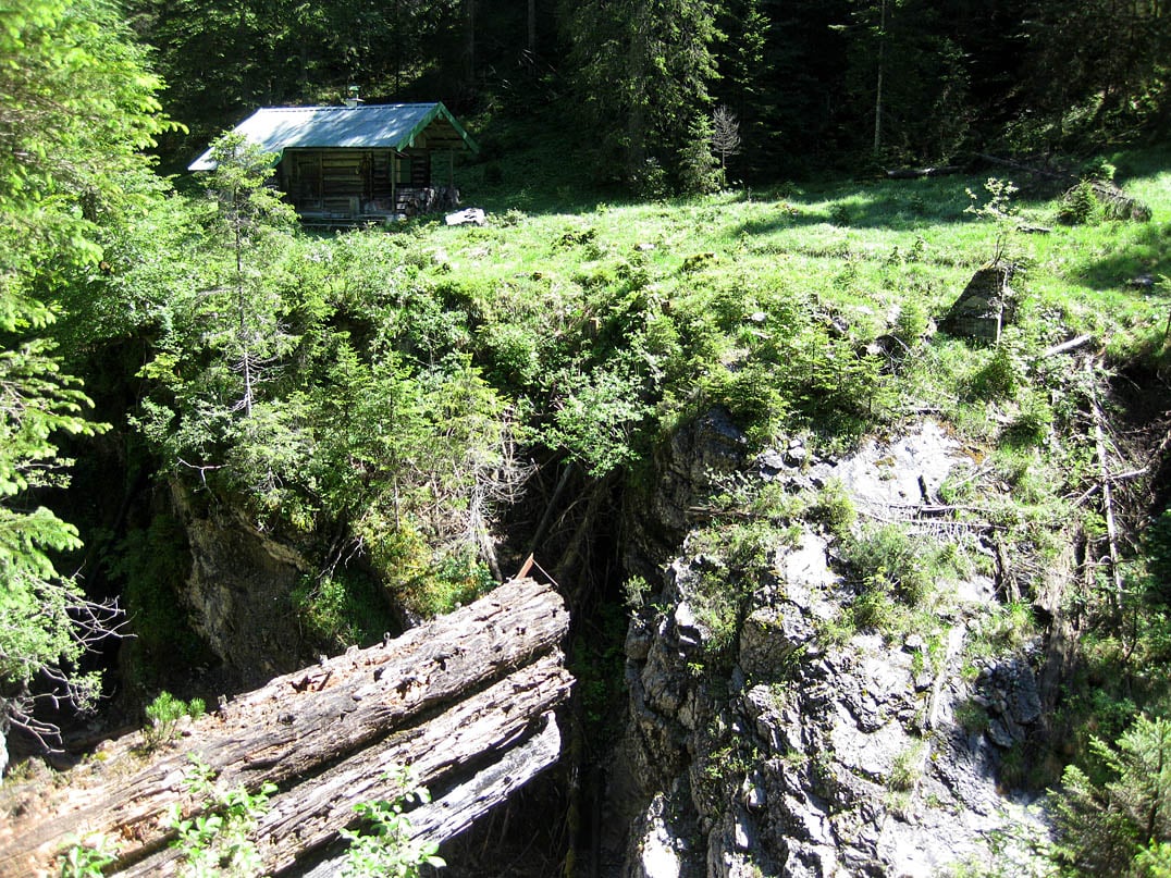 Nachdem wir uns also etwa einen Kilometer bergab rollen und dabei mit Blick auf das obere Lichteck (1980m) die Abzweigung zum Griesmann-Niederleger (1025m) sprichwörtlich rechts liegen lassen, überqueren wir die Brücke über den Oedlbach und fahren parallel zur stellenweise tief unten gelegenen, eindrucksvollen Klamm für weitere dreizehnhundert Meter voran, bis wir das Ende der befahrbaren Strecke erreicht haben. Hier heißt es nun Mountainbike im Wald verstecken und abschließen, Bike-Schuhe durch Bergstiefel ersetzen und zu Fuß weiter hinein ins Krottenbachtal. Vereinzelte Wegmarkierungen an Steinen sowie an Bäumen führen uns hierbei die ersten Meter durch den Wald und durch die unberührte Natur des malerischen Hochtals. Über einen schmalen Wanderpfad geht es zunächst zügig voran. Dabei überqueren wir kleine Bachläufe, gehen stets entlang des Bachlaufs der sich teilweise einige Meter tiefer seinen Weg gebahnt hat, passieren die Krottenbachtal Diensthütte (1072m) die sich auf der gegenüberliegenden Seite der Klamm befindet an welcher uns der Pfad vorbeiführt und wandern somit tiefer und tiefer taleinwärts bis wir nach etwa eineinhalb Kilometern schließlich die Brücke über den Krottenbach erreichen.
