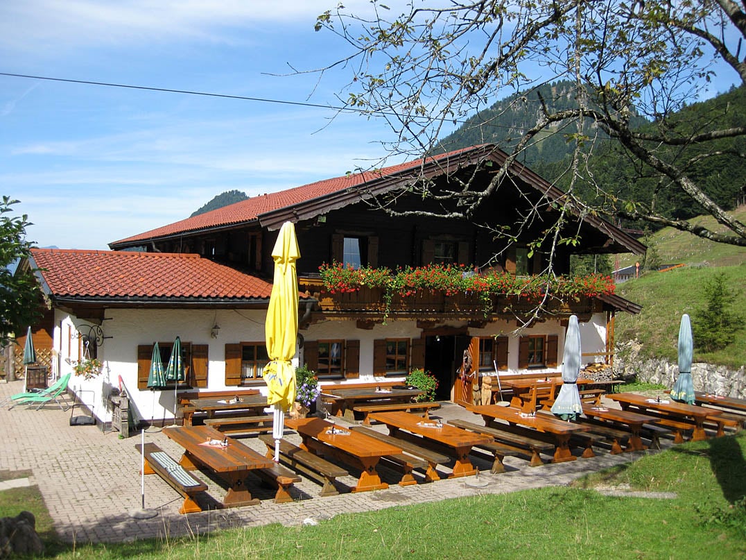 Zügig geht es weiter bergab, vorbei an der landwirtschaftlich genutzten Welzenalm (898m) bis zur nächsten Abzweigung an der wir uns rechts halten und unmittelbar auf den Berggasthof Edernalm (910m) zufahren. Die am Fuße des Riedlberg (1136m) gelegene Einkehr-Alm bietet von der Terrasse einen schönen Blick hinunter in die nahegelegene Gemeinde Kössen. Der Rückweg zum Ausgangspunkt nach Walchsee erfolgt über die von der Anfahrt bekannte Route.