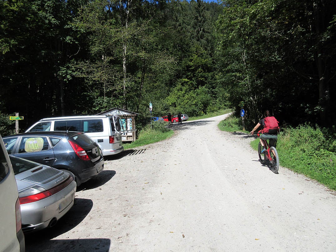 Insgesamt fast acht Kilometer und etwa sechshundertfünfzig Höhenmeter kurbeln wir seit Verlassen der Reschbergwiesen durch den teils schattigen Bergwald, der hier und da aufgrund lichter Passagen einen kurzen Blick in Richtung Kramerspitz (1985m) zu unserer Linken bzw. Vorderer Felderkopf (1928m) halb rechts von uns zulässt. Nach diesem langen Anstieg haben wir schließlich eine Kuppe erreicht. Zeit um kurz durchzuatmen. Denn nur wenige Minuten später treffen wir auf die beschilderte Abzweigung, der wir nach rechts weiter zur Enningalm folgen. Anfangs noch auf Kies, wird die kurze aber mit rund zwanzig Prozent Steigung ziemlich knackige Rampe gegen Ende zu einer betonierten Herausforderung für die Oberschenkel.