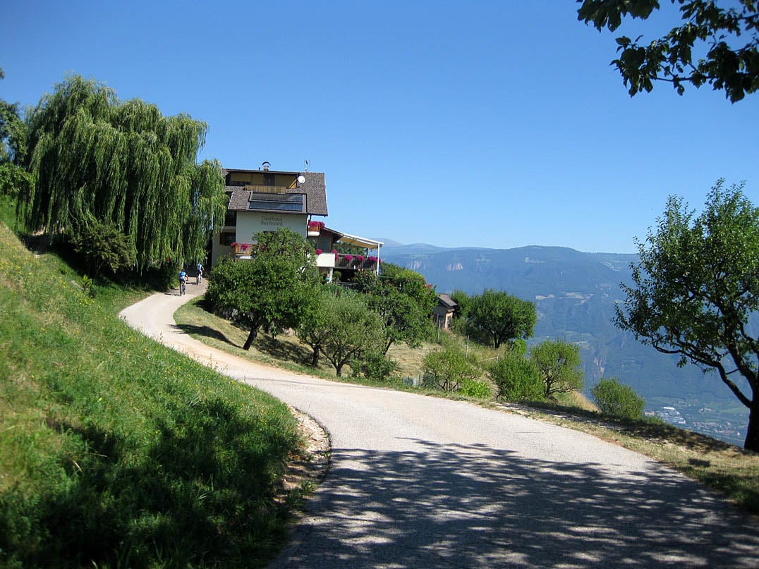 Die nur wenig befahrene Teerstraße schlängelt sich etwa drei Kilometer über die Ausläufer des Mendelkamms hinauf und lässt uns bei durchschnittlich elf Prozent Steigung schnell an Höhe gewinnen. Nach etwa dreihundertfünfzig Höhenmetern erreichen wir schließlich das obere Ende des Anstiegs und haben die größte konditionelle Herausforderung dieser Tour somit hinter uns. Etwa einen halben Kilometer verläuft die Straße leicht abfallend und führt uns anschließend aus dem Bergwald hinaus. Wir befinden uns plötzlich weit oben über dem Etschtal zwischen großzügigen Bergwiesen. Nur etwa einhundertfünfzig Meter weiter erreichen wir das Gasthaus Buchwald (958m), welches durch seine besondere Lage einen unbeschreiblichen Ausblick von der Sonnenterrasse weit über Bozen und das Etschtal hinweg auf die Dolomiten Gipfel um Schlern (2563m) und Co bietet.