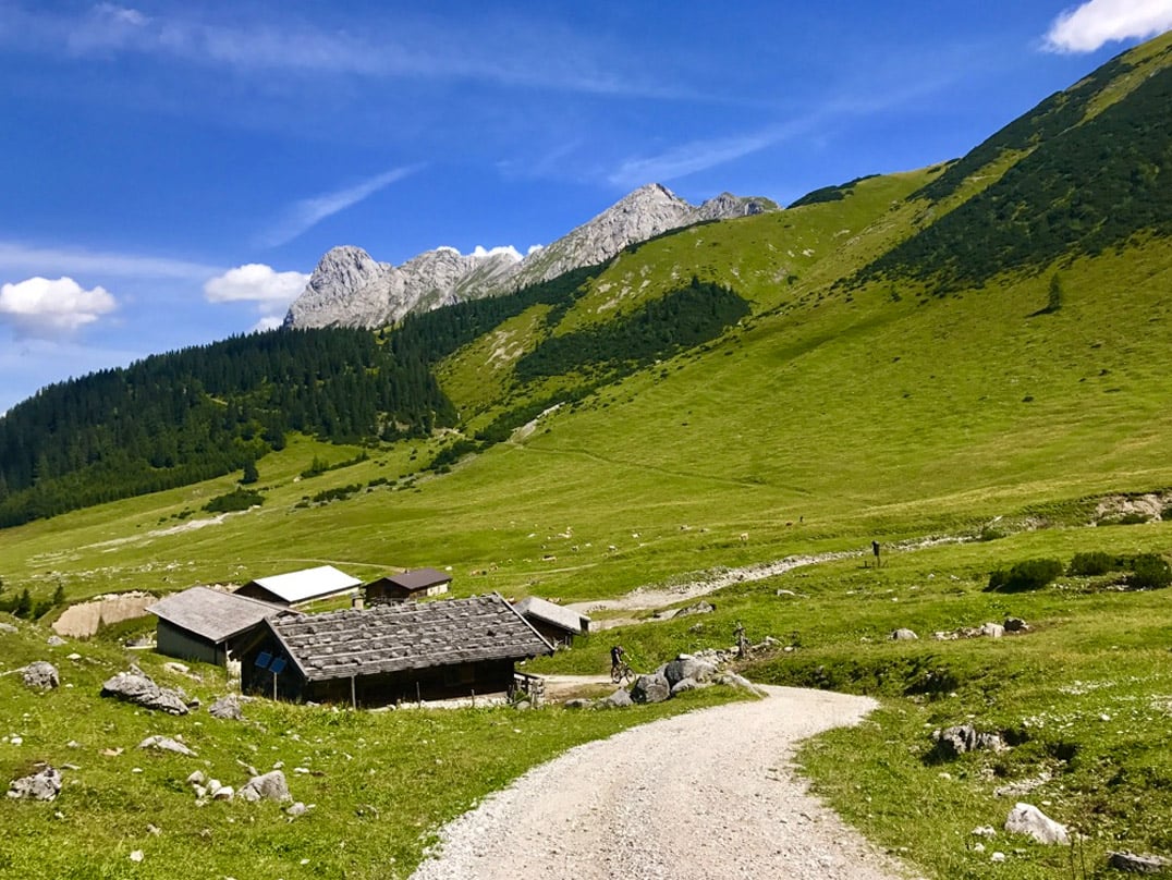 Wir halten uns aber links, überqueren das Geröllfeld und folgen der ausgeschilderten MTB-Route weiter mit Blick auf die Lalidererwände bergauf bis zur Ladiz-Alpe (1588m), einer kleinen Gruppe historischer Almhütten. Hier folgt nun das steilste Stück der Route, meist ist Absteigen nötig. Auf den nachfolgenden 500 Metern erreicht die Steigung über zwanzig Prozent, was die Auffahrt alles andere als ein Kinderspiel werden lässt. Wer den Versuch wagen möchte, diese Passage fahrend zu überwinden, sollte daher zuvor noch etwas pausieren. Egal ob fahrend oder schiebend, oben angekommen führt der Weg durch karger werdendes Gelände immer näher an die Lalidererwände heran und langsam aber sicher nähern wir uns dem Ziel der Tour.