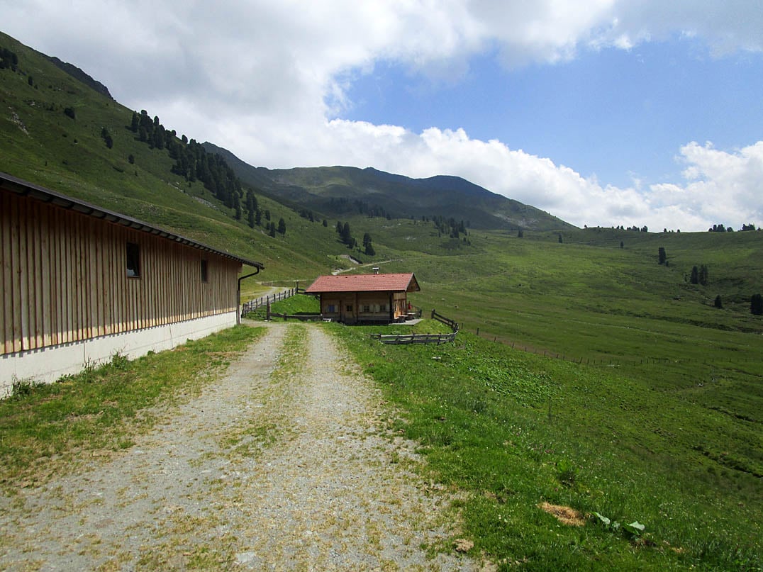 Nach knapp viereinhalb Kilometern Fahrstrecke seit Beginn der Tour in Inneralpbach gelangen wir in einer Rechtskurve an eine Weggabelung. Dank der Beschilderung halten wir uns rechts und fahren weiter in Richtung Faulbaumgartenalm und Steinbergalm. Damit halten wir uns zunächst auf der ausgewiesenen Mountainbike-Route 305, welche uns mit Blick auf Heimjoch (2004m), den großen Galtenberg (2424m) und den Torkopf (2116m) circa einen Kilometer später an der Abzweigung zur Innermareit-Alm (1460m) vorbeiführt und uns kurz darauf zur bewirteten Faulbaumgartenalm (1490m) bringt.