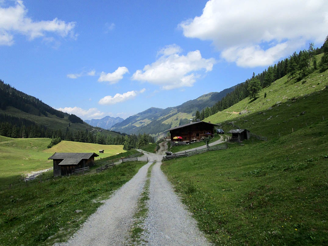 Vom Parkplatz im Ortskern von Inneralpbach fahren wir auf Höhe des Hotels Wiedersbergerhorn (940m) links in die Teerstraße ein und folgen dieser zunächst vorbei an zahlreichen Wohngebäuden nach Südosten. Nachdem wir allmählich die Ortschaft hinter uns gelassen haben, überqueren wir nach circa einem Kilometer den Lueger Bach auf die gegenüberliegende Seite und halten uns anschließend weiter rechts.