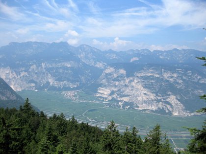 Während der darauffolgenden vier Kilometern passieren wir die Fraktion Hofstatt sowie einige Streusiedlungen des Gemeindegebiets von Kurtatsch. Trotz der zumeist wenig befahrenen Teerstraße halten wir uns stets am Rand und achten besonders in den engen Kurven auf entgegenkommende Fahrzeuge und Radler. Je höher wir kommen, desto deutlicher wird wie die zunächst dicht bebauten Siedlungen von Weinbergen und Obsthainen abgelöst werden. Und auch der Blick hinunter auf den Talboden sowie auf die gegenüberliegende Seite des Etschtals wird zunehmend eindrucksvoller.