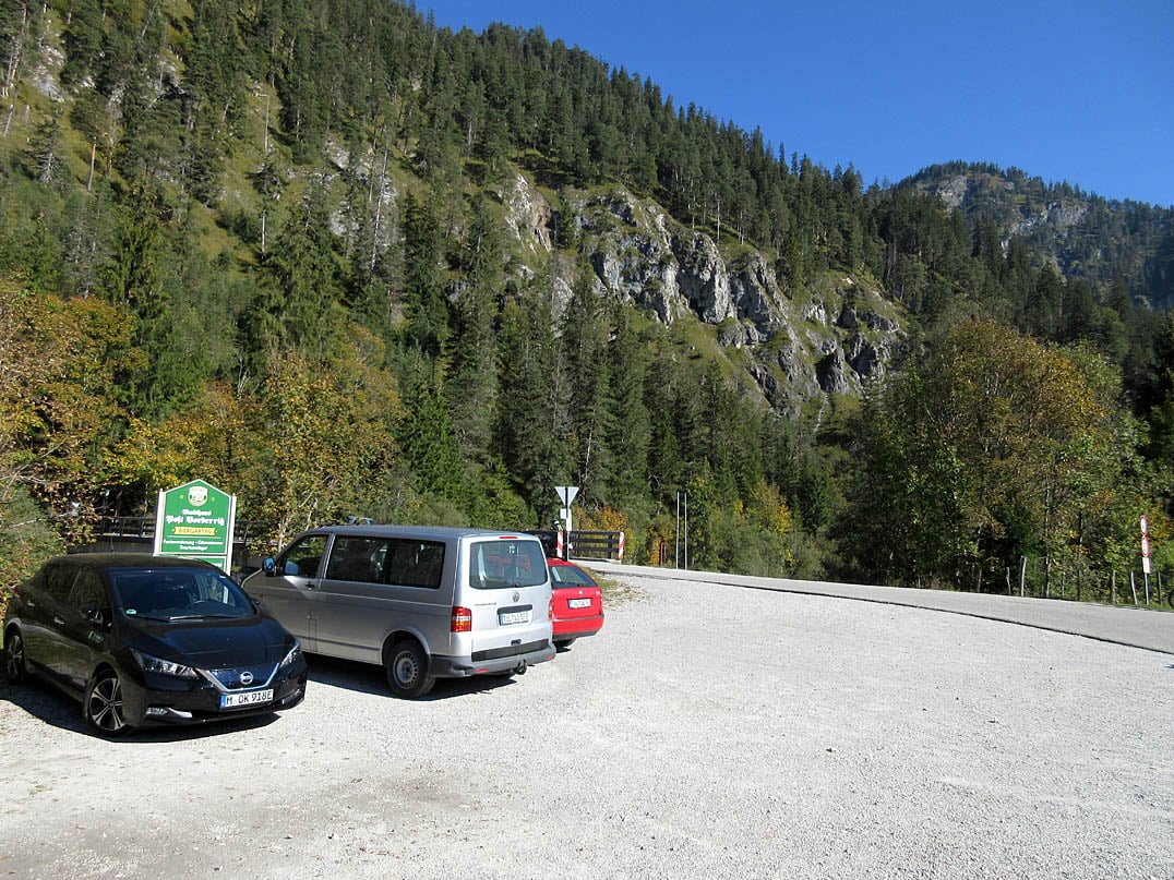 Vom Parkplatz nahe dem Gasthaus Post in Vorderriß aus folgen wir der Teerstraße über die Isarbrücke. Wir passieren die Mautstelle und fahren etwa einen Kilometer stets nahe des nördlichen Flussufers der Isar entlang bis wir zu einem kleinen Parkplatz gelangen. Dort führt uns eine hölzerne Brücke ein weiteres Mal über das Wasser hinweg. Nachdem wir nur wenige Meter auf dem Kiesweg hinter uns gebracht haben kommen wir an eine Weggabelung. Wer diese Tour alternativ in umgekehrter Richtung fahren möchte kann an dieser Stelle geradeaus weiterfahren, wir halten uns jedoch links und folgen der Beschilderung auf den Soiernweg.