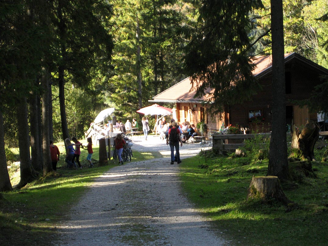 Wir folgen dem Weg auf einer knapp sechs Kilometer langen Genussabfahrt hinunter ins Tal bis kurz vor die Ortschaft Krün und halten uns noch bevor wir die Isar erreichen rechts. Der Brunnwassertraße folgend findet man nach etwa zwei weiteren Kilometern eine weitere Einkehrmöglichkeit - die Auhütte (857m) mit bestem Blick auf das obere Isartal sowie auf Wetterstein- und Estergebirge. Da es von hier aus aber noch knapp dreizehn Kilometer entlang des Isartals zurück zum Ausgangspunkt sind, eignet sich die Auhütte wohl eher für eine kurze Rast. Wie bereits erwähnt verläuft der Weg fortan stets durch das markante, urtümliche und idyllische Isartal. Dieser Teil der Strecke zeichnet sich vorallem durch die traumhafte Landschaft ab. Die wilde Isar bahnt sich ihren Weg durch das breite Kiesbett und die einzigartige Natur trägt ihren Beitrag die Fahrt durch das Isartal trotz desöfteren auftretender längerer Anstiege zu einem angenehmen Erlebnis werden zu lassen. Nach ungefähr zehn Kilometern biegen wir aus dem bewaldeten Gebiet links in die abwärts führende Forststraße in Richtung Isar ab und gelangen kurz darauf schließlich zur Abzweigung, an der wir dem Weg zu Beginn der Tour nach links gefolgt sind. Wir erreichen kurz darauf die Holzbrücke über die Isar und fahren die Mautstraße in östlicher Richtung zurück bis zu unserem Ausgangspunkt, dem Parkplatz nahe dem Gasthaus Post in Vorderriß.
