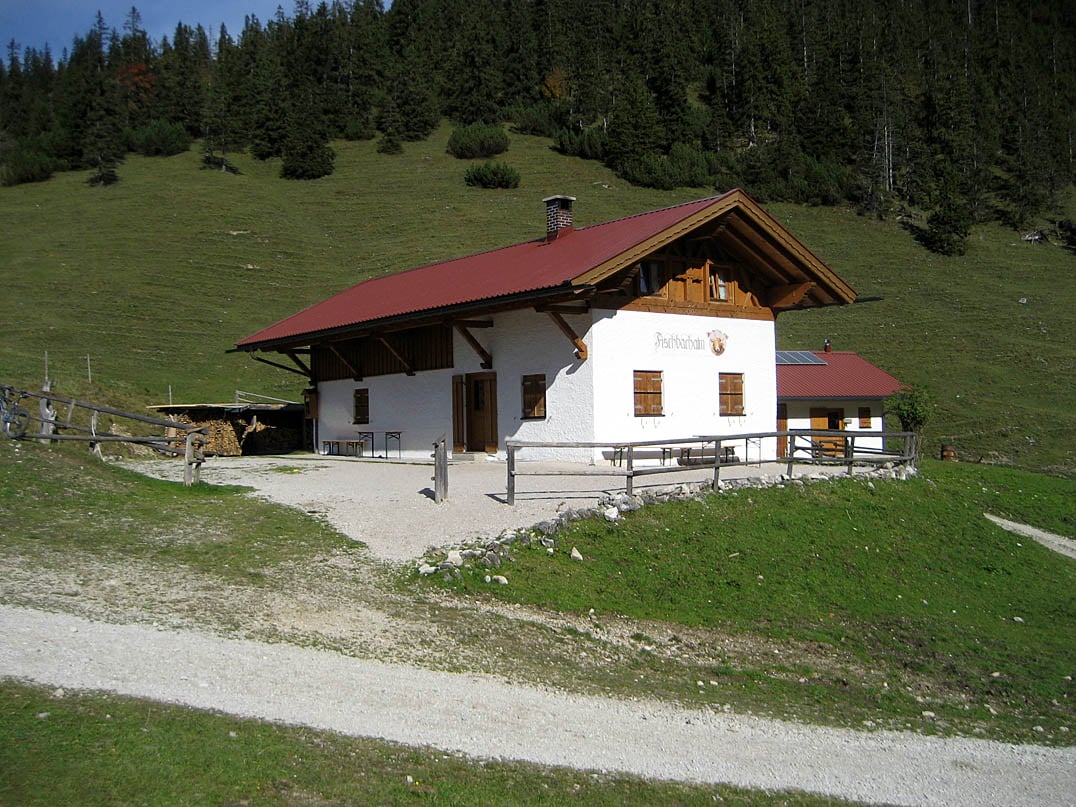 Hat man diese Schlüsselstelle hinter sich gelassen so erreicht man ein kleines Holztor hinter welchem sich die Beschaffenheit des Weges schließlich verbessert. Wir erreichen eine Weggabelung und folgen dort der Beschilderung weiter zur Fischbachalm. Würde man hier dem Weg stattdessen abwärts folgen erreicht man nach etwa zehn Minuten Fahrt die Materialseilbahn des bewirteten Soiernhauses (1616m) zu welchem man mit einem knapp vierzig minütigen Fußmarsch gelangt. Der Forstweg führt uns stetig bergauf durch den immer lichter werdenden Mischwald welcher letztendlich von einer grünen Almwiese abgelöst wird. Die Almhütte fest im Blick erreichen wir nach kurzer Zeit die Fischbachalm (1402m). Die vor wenigen Jahren neu errichtete Alm liegt idyllisch zwischen Fischbachkopf (1690m) und Ochsenstaffel (1871m) und trumpft vorallem durch den freien Blick in Richtung Soiernspitze (2257m) und Schöttelkarspitze (2050m). In den Sommermonaten ist die Fischbachalm bewirtet und eignet sich bestens zur gemütlichen Rast, bevor man ins Tal hinabfährt.