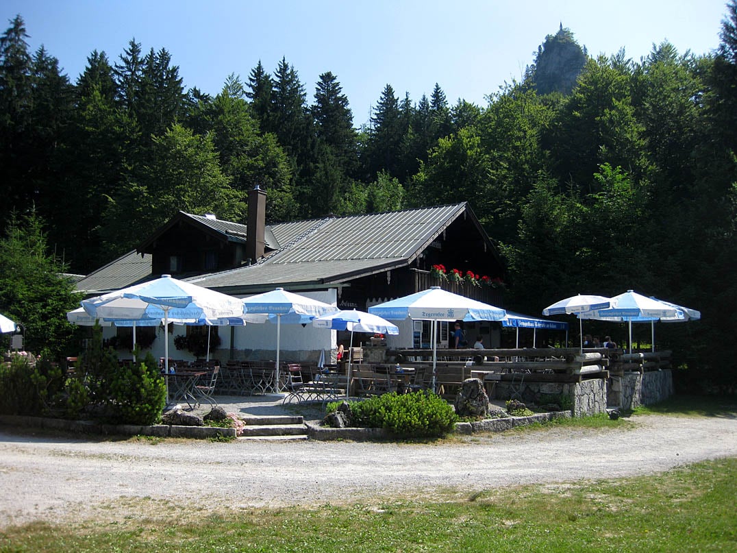 Meist flach oder gar abfallend und mit nur wenigen kleineren Anstiegen zwischendurch führt die Forststraße vorbei an den Ausläufern der Baumgartenschneid (1448m) und des Rohrkopfes (1316m) durch den Wald. Nach knapp zwei Kilometern erreichen wir schließlich eine kleine Kreuzung, an welcher wir dem schmalen und teilweise steilen Weg hinauf in Richtung Galaun und Riederstein (1207m) folgen. Die folgenden circa vierhundert Meter sind teilweise recht steil mit bis zu zwanzig Prozent Steigung und sollten bei Bedarf schiebend bewältigt werden. Hat man die wenigen hundert Meter jedoch überwunden, befindet man sich bereits am Ziel der Tour - dem Berggasthof Riederstein am Galaun (1060m), einem der beliebten Aussichtspunkte des Tegernseer Tals. Wer sich vor einer Brotzeit mit Aussicht auf der Terrasse des Berggasthofs noch etwas verausgaben möchte, sollte den circa fünfundzwanzigminütigen Fußmarsch hinauf zum Riederstein (1207m) nicht auslassen. Neben der Aussicht vom Felssporn über das gesamte Tal hinweg auf die umliegenden Berge ist vor allem die Riedersteinkapelle ein seltenes Erlebnis. Die im Jahre 1841 von einem Schlossdiener aus dem Schloss Tegernsee erbaute, neugotische Kapelle wurde 1863 fertiggestellt und thront seither auf dem etwa einhundertfünfzig Meter hohen Felssporn, welcher nahezu senkrecht aus dem Hang der Baumgartenschneid herausragt.