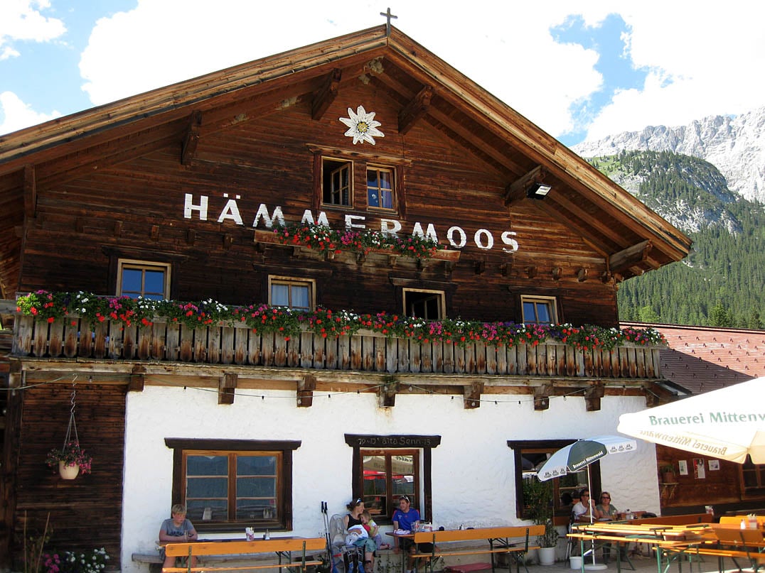 Obwohl wir nach zwei Kilometern und einhundertsiebzig gefahrenen Höhenmetern nun leider bereits das Ziel der Tour erreicht haben ist die liebevoll geführte Alm mit großer Terrasse vor der eindrucksvollen Kulisse des Wettersteins im Norden und der Hohen Munde (2662m) am Ostende der Mieminger Kette im Süden ein gemütliches Fleckchen um eine kurze Rast einzulegen. Mit etwas Glück vernimmt man zünftige Harfenklänge von Harfinist Albert, der mehrmals die Woche auf der Hämmermoos musiziert.