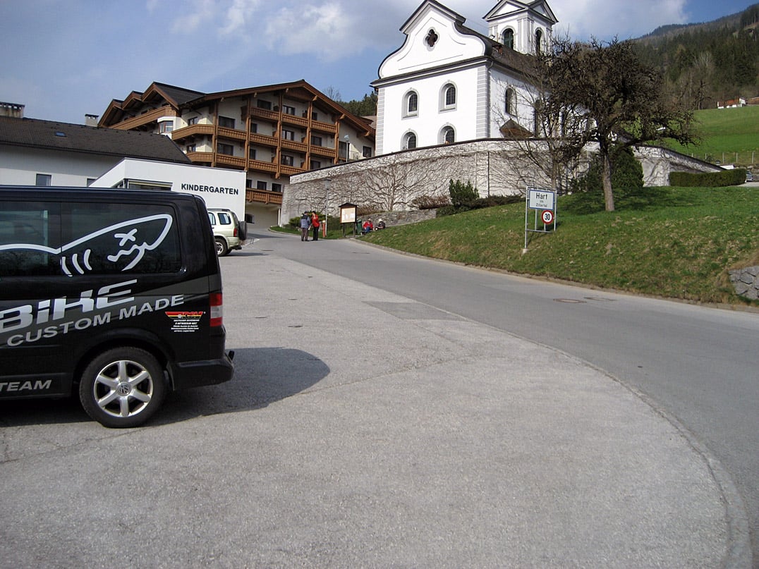 Nach ungefähr eineinhalb Kilometern Abfahrt kommen wir zu einer weiteren Gabelung. Circa hundert Meter nach rechts befindet sich der Säulinger Hof (840m), der sich durch seine aussichtsreiche Sonnenterrasse ideal zur Rast anbietet. Wir halten uns jedoch links und fahren weitere zweieinhalb Kilometer vorbei an vielen schönen Häusern und einer Kapelle immer mit Blick auf das Inntal und die Berge bis zu einer Kreuzung, die uns bereits vom Beginn der Tour bekannt ist. Dieser folgen wir nach rechts hinab zum Ausgangspunkt - dem Parkplatz am Ortseingang von Hart.