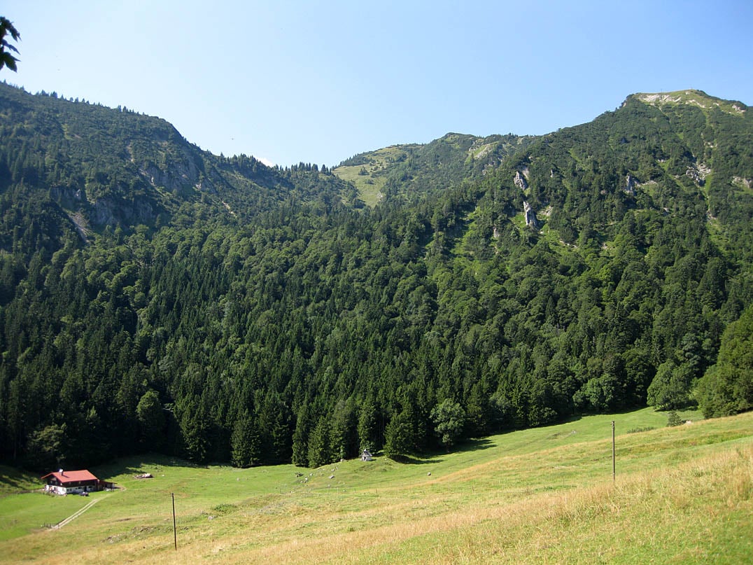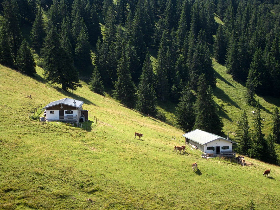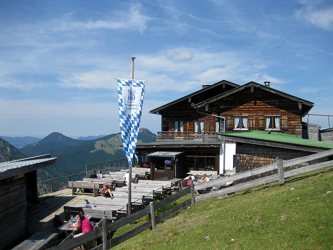 Von hier geht es nun zu Fuß weiter über den Steig hinauf zum Hirschberghaus (1535m). Der Steig führt nur wenige Meter durch den Wald hinauf, ehe die hohen Bäume schließlich von Latschen und sonstigen Sträuchern abgelöst werden. Bereits nach wenigen Minuten öffnet sich der Blick über das Tegernseer Tal und auf den türkisblauen Tegernsee. Entlang des steilen Hanges geht es über Stock und Stein weiter bergauf. Nach etwa sechshundert Metern entlang des angenehm begehbaren Sommersteigs haben wir die rund einhundertundzwanzig Höhenmeter überwunden und erreichen das Eingangstor zum Almgebiet des Hirschberghauses, an welchem wir nur wenige Minuten später ankommen. Es empfiehlt sich, eine Einkehr auf der Sonnenterrasse des idyllisch gelegenen Hirschberghauses (1535m) etwas nach hinten zu verlegen und zuvor noch den Gipfel zu besuchen, dies sollte man aber abhängig von der zugrunde liegenden Kondition machen.