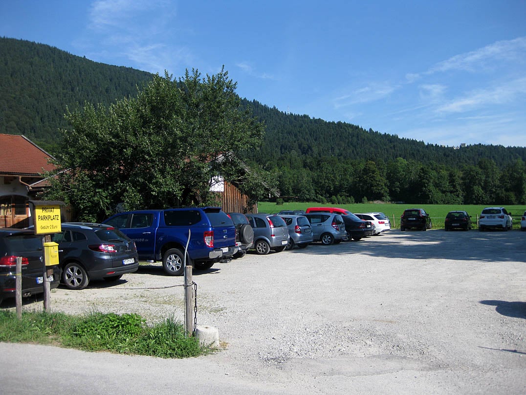 Vom Parkplatz aus folgen wir dem Hirschbergweg nach Westen, während uns an einigen Stellen die Beschilderung den richtigen Weg in Richtung Hirschberg und Hirschberghaus deutet. Etwa einen halben Kilometer führt uns die Teerstraße durch Scharling hindurch bis der Weg plötzlich steil wird und den Hang hinauf in Richtung Wald führt. Als wir diesen schließlich erreichen, befinden wir uns auf der gekiesten Forststraße hinauf zum Hirschberg, die im Winter vornehmlich als Rodelbahn genutzt wird. Knapp dreihundert Meter geht es nun mit bis zu fünfundzwanzig Prozent Steigung bergauf - eine erste kurze Herausforderung, die jedoch durch ein darauffolgendes flaches Stück gleich wieder kompensiert wird. Für wen diese Passage bereits überraschend anstrengend war, gilt es fortan jede Möglichkeit der Regeneration wahrzunehmen. Die durchschnittliche Steigung beträgt um die fünfzehn Prozent und die kontinuierlich anstrengende Auffahrt wird auf den darauffolgenden eineinhalb Kilometern nur an wenigen Stellen durch kurze, kaum nennenswerte flache Streckenabschnitte unterbrochen.