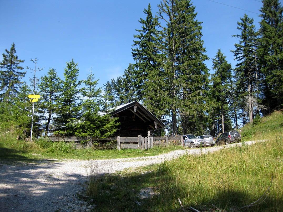 Nachdem wir bislang die meiste Zeit im Dunkel des Waldes gefahren sind, lichtet sich der Wald an einer Abzweigung unterhalb des Bolzecks (1065m) etwas und so erblicken wir bereits von hier unten das Rauheck (1509m) und die östliche Flanken der Hirschberg Ausläufer. Wir folgen der Fahrstraße weiter bergan, passieren kurz darauf die Abzweigung nach Links zur Holzpointalm (1120m) und auch den nur wenige Meter weiter nach rechts in Richtung Reitköpfl (1166m) verzweigende Weg lassen wir ungeachtet an uns vorbeiziehen. Wir fahren weiter geradeaus, folgen einer Spitzkehre, fahren vorbei am ausgeschilderten Wandersteig hinauf zum Hirschberg und biegen nach circa vierhundert Metern schließlich der Beschilderung folgend in eine Linkskurve ein. Der Weg wird nun endlich flacher und nach einem kleinen letzten Anstieg erreichen wir schließlich die Talstation der Materialseilbahn an der Hirschlache (1335m). Dort gilt es schließlich sein Mountainbike gut gesichert zurück zu lassen.