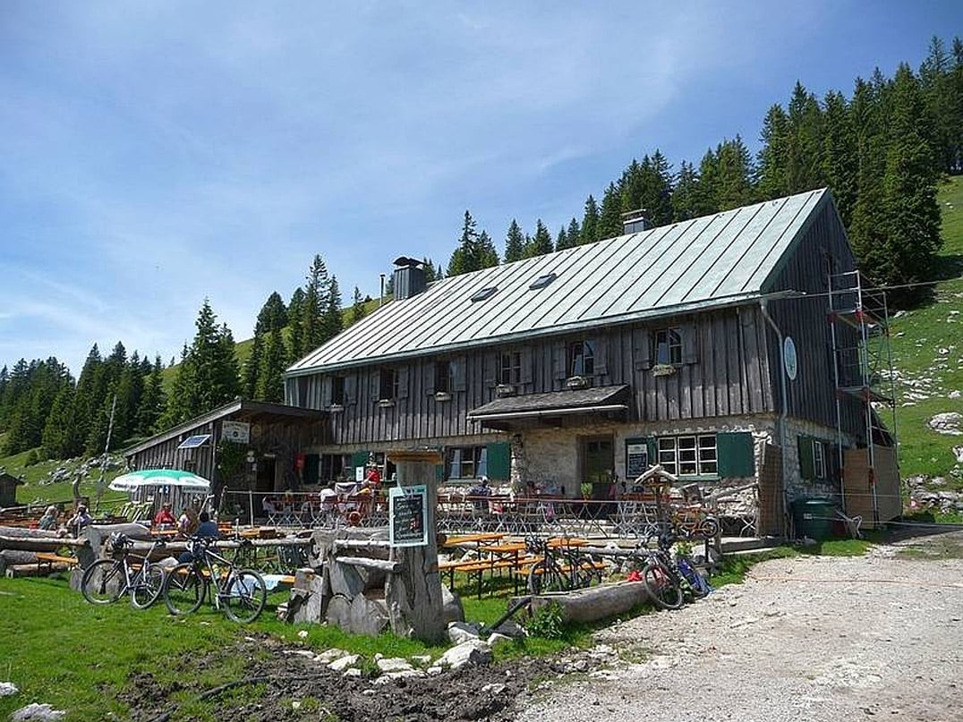 Nur wenige Meter weiter finden wir uns auf einer großzügigen Lichtung wieder, die vielmehr als ein Ausläufer des Almgebiets der Hofalm (1050m) anzusehen ist. Etwa siebenhundert Meter folgen wir dem Kiesweg hinauf und biegen anschließend in eine Spitzkehre zu unserer Rechten ein, die uns in einem weiten Bogen um die privat genutzte Rauchalm (900m) lenkt. Nach circa einem halben Kilometer mit stellenweise anspruchsvoller Steigung passieren wir die Abzweigung zur Winterstube und zur Schmiedalm (940m). Letztere war im Jahr 2012 bekannt geworden, als sie dem Bayerischen Fernsehen als Drehort für die OpenAir-Sendung "Kabarett auf der Alm" mit Gerhard Polt und den Gebrüdern Well diente. Vor unseren Augen erscheint schließlich die fast ganzjährig geöffnete Frasdorfer Hütte (950m), ein beliebtes Ausflugsziel in der Chiemsee-Region. Da sich die Frasdorfer Hütte etwa auf halber Strecke zur Riesenhütte (1345m) befindet, lassen wir die Einkehrmöglichkeit unbeachtet und folgen dem Forstweg weiter hinauf.