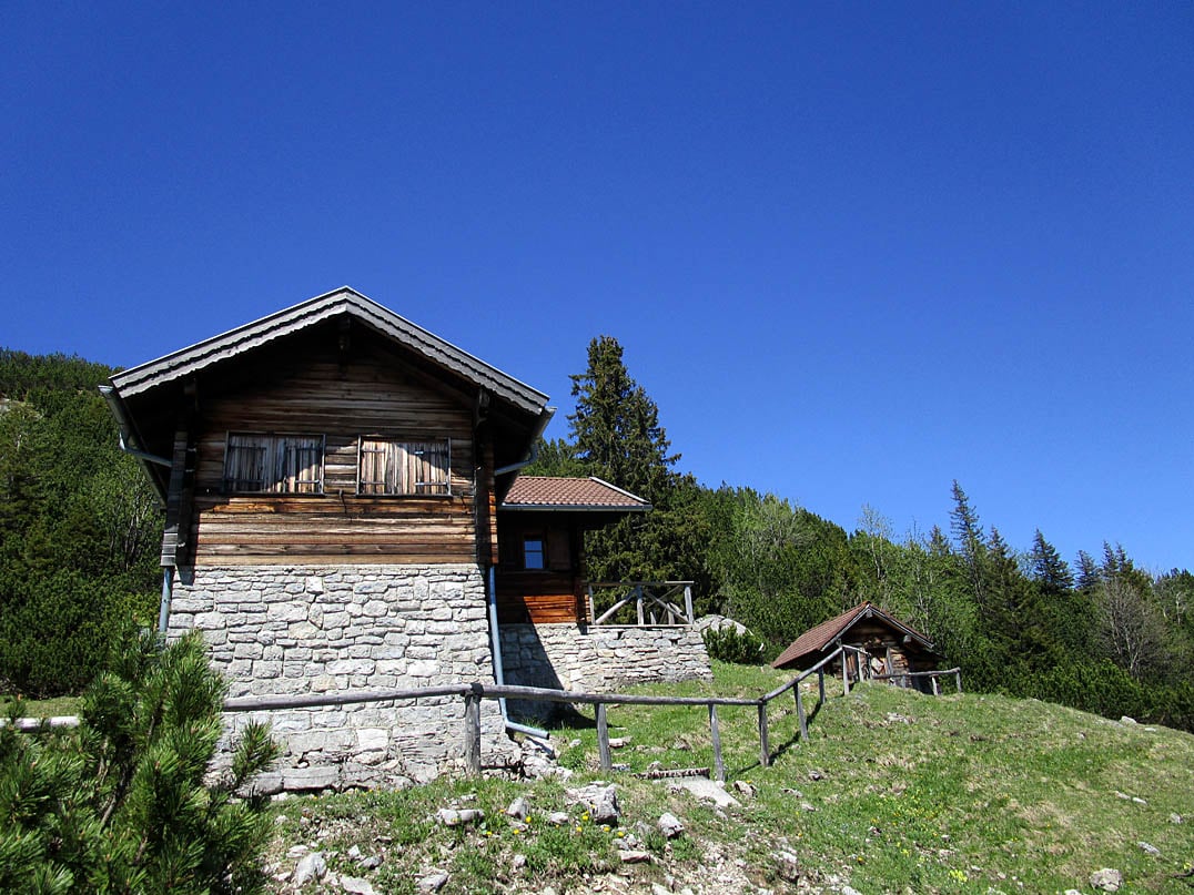 Wir haben den langen Anstieg schließlich hinter uns als wir aus dem Wald herauskommen und in das freie Almgebiet rund um die Hohe Kisten (1922m) einfahren. Die Landschaft öffnet sich und unsere Blicke schweifen über die von Geröll durchzogenen Weideflächen. Noch etwa siebenhundert Meter und wir erreichen die hin und wieder bewirtete Rechtlerhütte (1843m) - auch als Kuhalm bekannt. Hier an der idyllisch gelegenen Almhütte ist der gut beschaffene Fahrweg zu Ende.