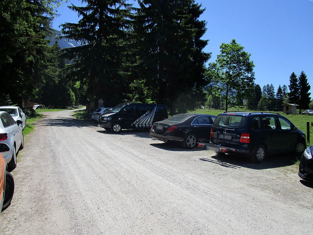 Vom Parkplatz am Ortsrand der Gemeinde Eschenlohe folgen wir dem Mountainbike-Wegweiser "Zur Kuhalm". Nach nur etwa zweihundert Metern macht der Kiesweg eine Linkskurve und beginnt anzusteigen. Nachdem wir die Schranke hinter uns gelassen haben, geht es anschließend rund vier Kilometer mit bis zu zwanzig Prozent Steigung unentwegt bergauf.