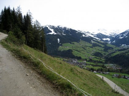 Von dort sind es nur noch wenige hundert Meter bis zu besagter Almhütte, die durch ihre freistehende Lage mit Ausblick in die Alpen zur kurzen Rast einlädt. Wer es noch etwas aushält, dem wird geraten, erst an der Bischofer Alm (1320m) einzukehren, da es nach der Holzalm erst einmal rund um den Gratlspitz geht. Wir fahren weiter, nicht in Richtung Außer- und Innerhauser Almen, sondern nehmen an der Gabelung den Weg zu unserer linken, welcher nochmal ordentlich bergauf geht und folgen diesem bevor wir uns erneut links halten. Das Gipfelkreuz lassen wir rechter Hand liegen und fahren über den neu angelegten Weg bis zu einer Aussichtsbank. Dort wird man durch einen herrlichen Ausblick über das Alpbachtal mit dem Wiedersberger Horn für die bisherigen Strapazen belohnt.