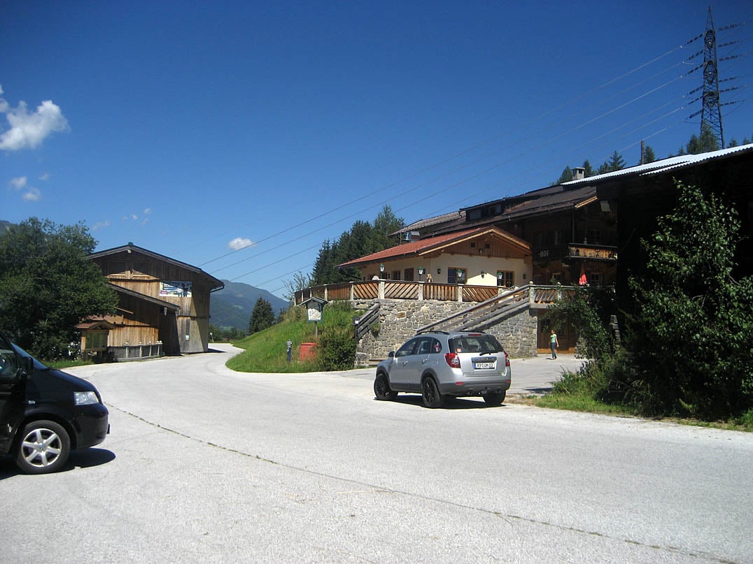 Die als Panoramatour deklarierte Genussroute entlang des Isskogels starten wir am Alpengasthof Enzian und folgen zu Beginn der geteerten Straße etwa einen Kilometer weit mit stellenweise leichtem Gefälle in östlicher Richtung. Bei Gerlosberg biegen wir schließlich an einer Verzweigung links ab und nehmen dabei die ersten Höhenmeter an Steigung in kauf. Bereits zu diesem Zeitpunk lässt sich erahnen, dass die Tour zu einem wahrlich aussichtsreichen "Biker-Schmankerl" werden dürfte. Etwa eineinhalb Kilometer weiter verzweigt die Straße ein weiteres mal, wir folgen der Linkskurve bergan und befinden uns alsbald auf einer Kiesstraße, die uns die nächsten Kilometer durch den Bergwald führt. An der nächsten Abzweigung etwa fünfhundert Meter weiter halten wir uns rechts. Mit durchschnittlich zwölf Prozent Steigung geht es durch den Wald, vereinzelte Blicke auf benachbarte Täler und Gipfel wie die Ahornspitze (2973m) versüßen dabei die Auffahrt. Nachdem sich der Weg ein weiteres Mal nach links wendet flacht die Steigung ein wenig ab, wir halten uns im weiteren Verlauf rechts und folgen dem Weg anschließend durch eine Rechtskurve. Der Wald lichtet sich immer mehr und wir erreichen nach weiteren zwei Kilometern schließlich die Kreuzwiesenalm (1924m), deren Sonnenterrasse mit einer malerischen Aussicht über den im Tal fließenden Ziller hinweg auf die gegenüberliegenden Berggipfel Innerer Falk (2666m) und Brandberger Kolm (2700m) zur kurzen Rast mit Fernblick lockt.