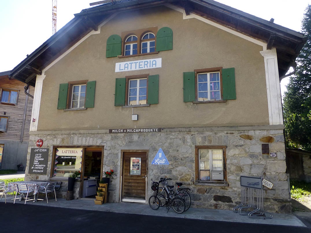 Unten heraus fahren wir auf Wiesen und über Forststraßen in den Ort Casaccia. Vor dem Haus mit der markanten, roten Fensterfront biegen wir links ein. Weiter geht es geradeaus und rechts auf die Hauptstraße, die uns zum Pass Maloja führt. Vorbei an einer alten Kirche geht es zuerst langsam, später stetig in Haarnadelkurven bergauf ehe wir den Pass Maloja überwunden haben und vor dem Ortschild von Maloja stehen. Am Bistrot Kulm (1800m) gönnen wir uns nach der Auffahrt eine kurze Pause und stärken uns, während wir den Ausblick genießen. Alternativ findet man ein paar Meter weiter im Ort links die Latteria (1824m). Dort gibt es super leckeren Joghurt aus dem Bergell und andere Köstlichkeiten der Region mit Sitzgelegenheit vor dem Laden.
