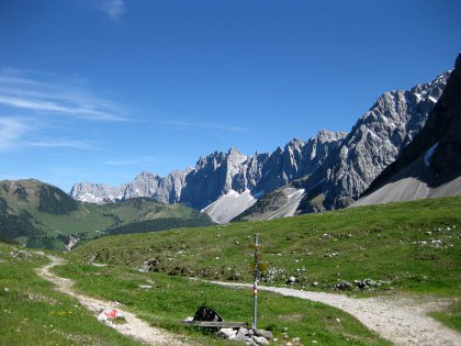 An der Weggabelung direkt neben dem privat genutzten Pürschhaus (1399m) sehen wir uns nun drei möglichen Richtungen gegenüber. Der Weg links vorbei am Denkmal führt in Richtung Falkenhütte (1850m). Der Weg rechts an den Hütten vorbei führt über das Untere Filztal hinauf auf den Hochalmsattel in Richtung Karwendelhaus (1771m), wird jedoch schon nach kurzer Zeit zu einem Steig und ist somit für die Fahrt mit dem Mountainbike ungeeignet. Und so folgen wir also dem Weg geradeaus über den kleinen Ahornboden hinweg auf die Felswände zu, der durch einen Wegweiser zudem als Mountainbike-Strecke ausgewiesen ist. Wir verlassen nach nur wenigen hundert Metern den Almboden und bewegen uns schnurstracks auf die Ausläufer der Kaltwasserkarspitze (2733m) zu. Nach und nach verschlechtert sich die Beschaffenheit des Fahrweges, der sich nachfolgend rund zwei Kilometer weit den Hang hinauf schlängelt. Rund zehn Prozent Steigung, grober Schotter und eine relativ schmale Straße erschweren die Auffahrt. Insbesondere in den vielen engen und unübersichtlichen Kurven ist sowohl bei der Auffahrt, als auch der anschließenden Abfahrt Vorsicht geboten. Insbesondere bei gutem Wetter ist diese Strecke gut und gern befahren, daher sollte man stets auf Gegenverkehr eingestellt und bremsbereit sein.