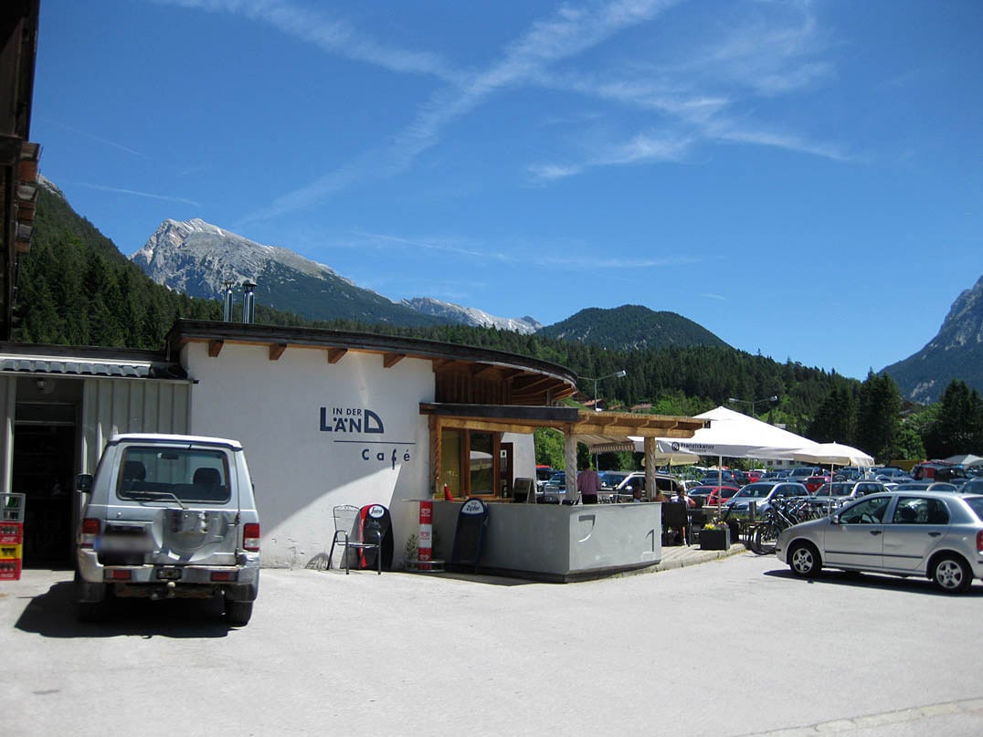Nachdem wir die Bundesstraße vorsichtig überquert haben fahren wir am rechten Fahrbahnrand entlang weiter nach Scharnitz bis zur Pfarrkirche Mariahilf, vor welcher wir links in die Hinterautalstraße einfahren und kurze Zeit später an den großen Parkplatz der Karwendeltäler gelangen. Wir passieren diesen sowie das Café In der Länd (966m) und fahren noch rund vierhundert Meter geradeaus bis wir an eine große Holztafel kommen, die uns die Weiterfahrt nach links hinein ins Karwendeltal weist.