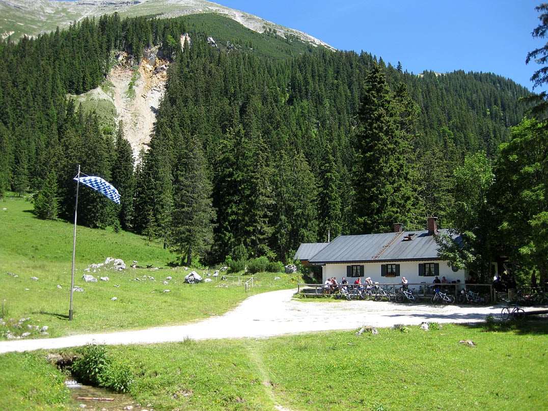 Am anderen Ufer angekommen halten wir uns an der komfortablen Forststraße links und erreichen so nach rund drei Kilometern die bewirtete Vereiner Alm (1406m), ein nettes Plätzchen um einen ersten kurzen Zwischenstopp einzulegen. Nach einer kurzen Rast geht es auf der breiten Forststraße westwärts weiter und nach kurzem Anstieg schließlich hinunter in Richtung Mittenwald. Es folgt eine knapp sechs Kilometer lange, rasante Abfahrt mit gelegentlichem Ausblick auf das Zugspitzmassiv. Dabei müssen wir aufpassen, dass wir nicht an der beschilderten Abzweigung vorbeifahren und plötzlich am Isarhorn ankommen - vorher nämlich gilt es links abzubiegen und dem schmalen Weg gemäß Wegweiser nach Mittenwald zu folgen.