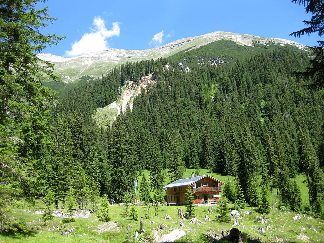 Die ersten zweieinhalb Kilometer geht es teilweise ordentlich bergauf, jedoch sind die Mühen vergessen wenn man die Wohnhäuser hinter sich gelassen hat und in den beschaulichen Kiefernwald eintaucht - spätestens aber wenn sich der Wald lichtet und sich vor uns das malerische Karwendeltal ausbreitet welches von der Nördlichen Karwendelkette und der Hinterautal-Vomper-Kette mit Pleisenspitze (2569m) und Birkkarspitze (2749m) eingerahmt wird. Knapp zehn Kilometer folgen wir dem breiten Forstweg parallel zum Karwendelbach tief ins Tal hinein bis wir etwas hinterhalb der Angeralm (1358m) an die Auffahrtspassage zum höchstgelegenen Punkt dieser Tour gelangen. Auf den darauffolgenden fünf Kilometern kurbeln wir rund vierhundertfünfzig Höhenmeter bergan. Je höher wir kommen desto näher rückt das Karwendelhaus (1771m), das über uns in einer Steinwand thront.