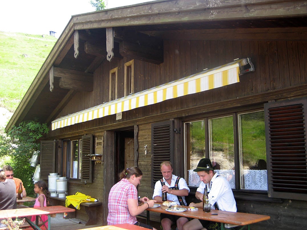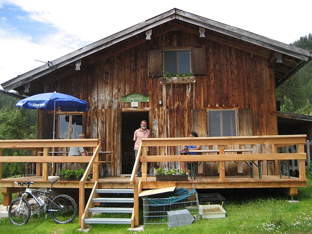 Zügig fahren wir durch das vom Bergwald umsäumte Almgebiet auf dem parallel zur Grundache folgenden Kiesweg. Unmittelbar nachdem wir die Grundache an einer Brücke überquert haben, entscheiden wir uns für den Weg rechts, welcher uns Meter um Meter vom Bachlauf entfernt und in den Wald hineinführt. Nach etwa achthundert Metern halten wir uns an einer Verzweigung erneut rechts. Auf der darauffolgenden knapp viereinhalb Kilometer langen Teilstrecke nimmt die Steigung an einigen Stellen wieder etwas zu und so gewinnen wir weitere einhundert Höhenmeter auf unseren Mountainbikes. An einer Weggabelung halten wir uns nun ein weiteres Mal rechts. Wer sich die Auffahrt zur Enteralm sparen möchte, kann hier geradeaus weiterfahren. Der Weg verläuft bergab und führt einen weiter vorne schließlich wieder auf die Abfahrtsstrecke, über die man sonst von der Enteralm hinabfährt. Wir fahren jedoch bergan und gelangen nur wenige Meter weiter auf ein freies Almgebiet. Die nachfolgende, circa einen Kilometer lange Passage hinauf zur Enteralm (1324m) gestaltet sich nach der doch längeren leichten Teilstrecke als steilerer Anstieg. Von der Jausenstation aus hat man einen großartigen Ausblick auf die felsige Südflanke der Guffertspitze (2195m) zur Rechten, die Ostseite von Vorderunnütz (2078m) sowie Hochunnütz (2075m) und Hinterunnütz (2007m) zur Linken und nicht zu vergessen die dazwischenliegende Gemeinde Steinberg am Rofan, durch welche wir im weiteren Verlauf dieser Tour noch fahren werden.